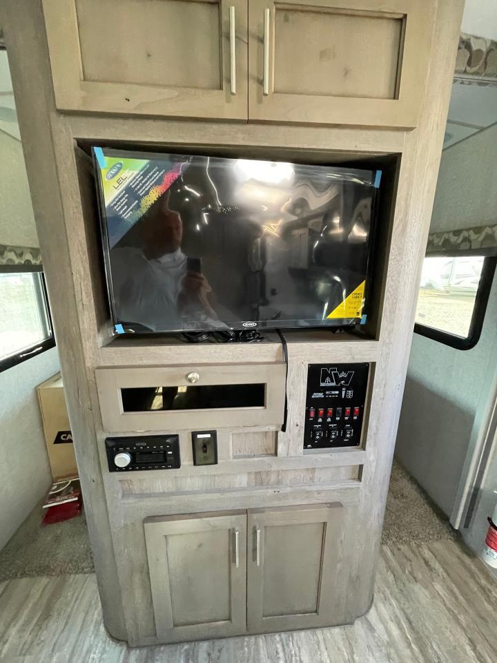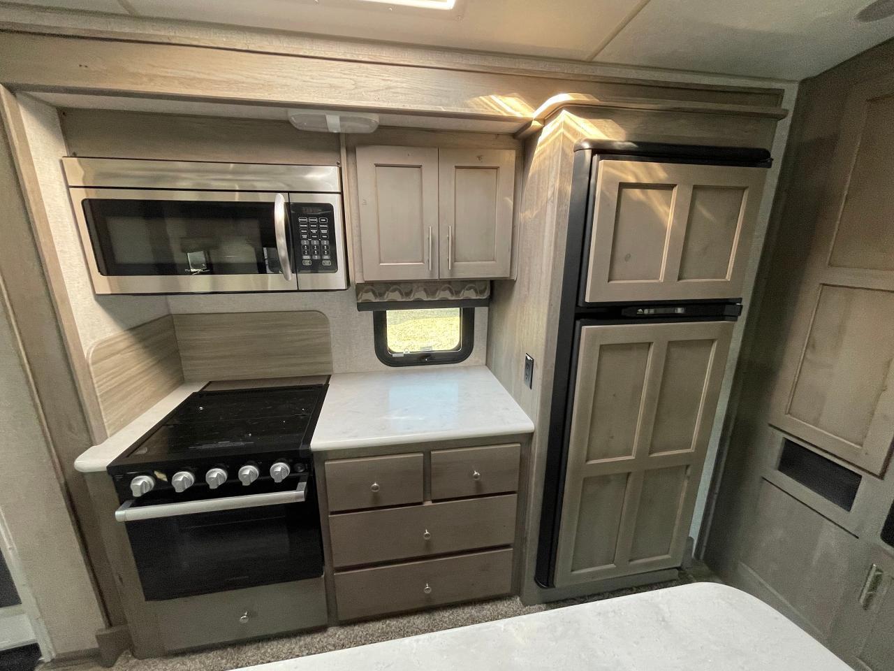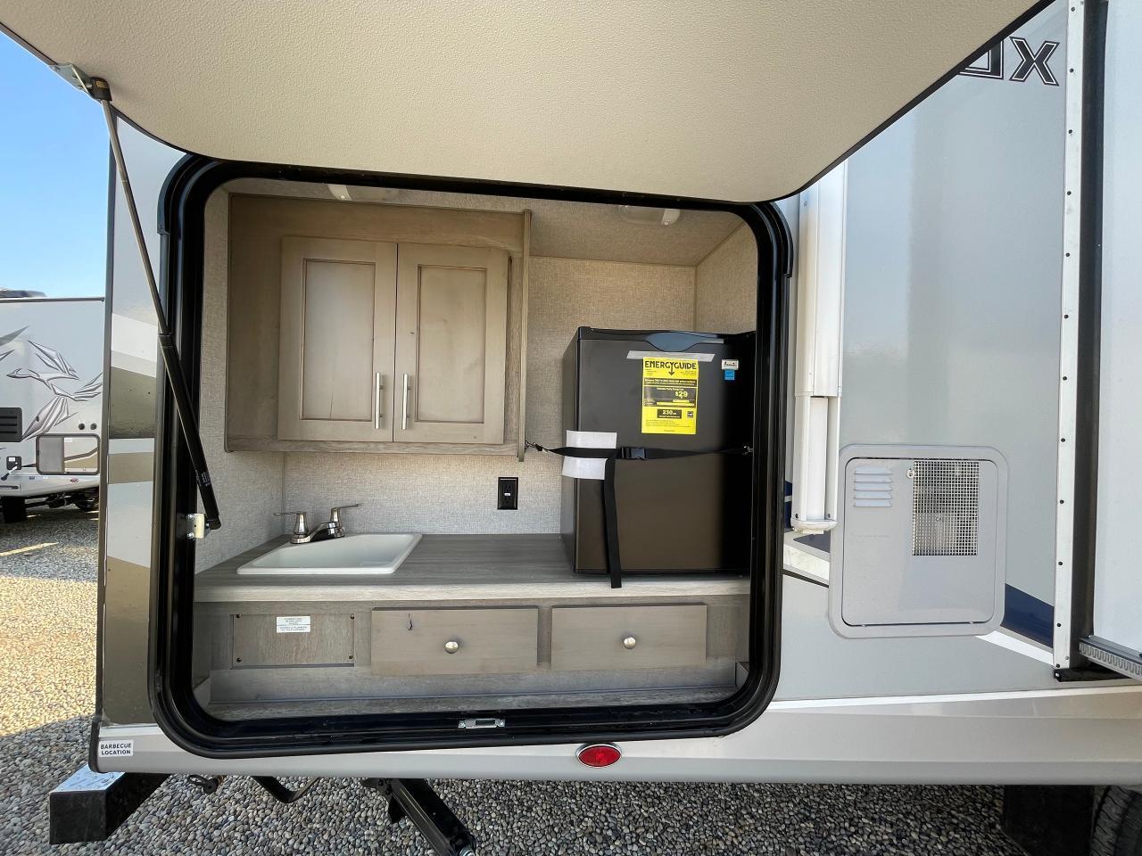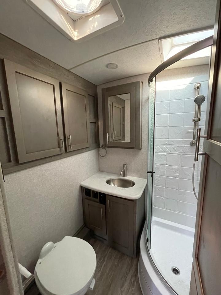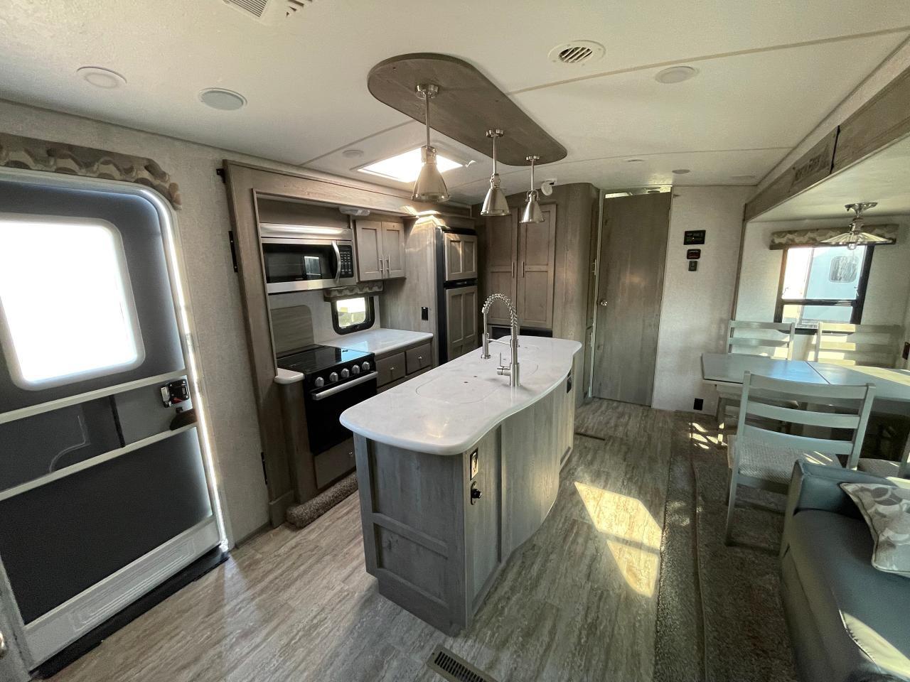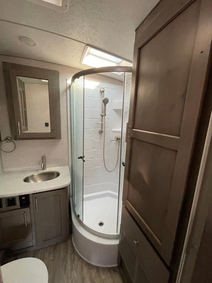 45W Solar Panel, LED Lighting, Interior Command Center, 10 Cu Ft LP/AC Refrigerator, Convection Microwave, Daylighter Skylight w/Shade, LPG Quick Connect, Black Water Flush System, Exterior Shower, Winterization and Bypass System, 10 Gal Gas/AC Water Heater, Ducted AC w/ Digital T-Stat, 12V LED Awning, TV Antenna, Exterior Speakers, Battery Disconnect, Solid Surface Countertops, Slow Rise Night Shades, Fantastic Fan, Queen Mattress, USB Charge Ports, Recessed Storage Headboard.