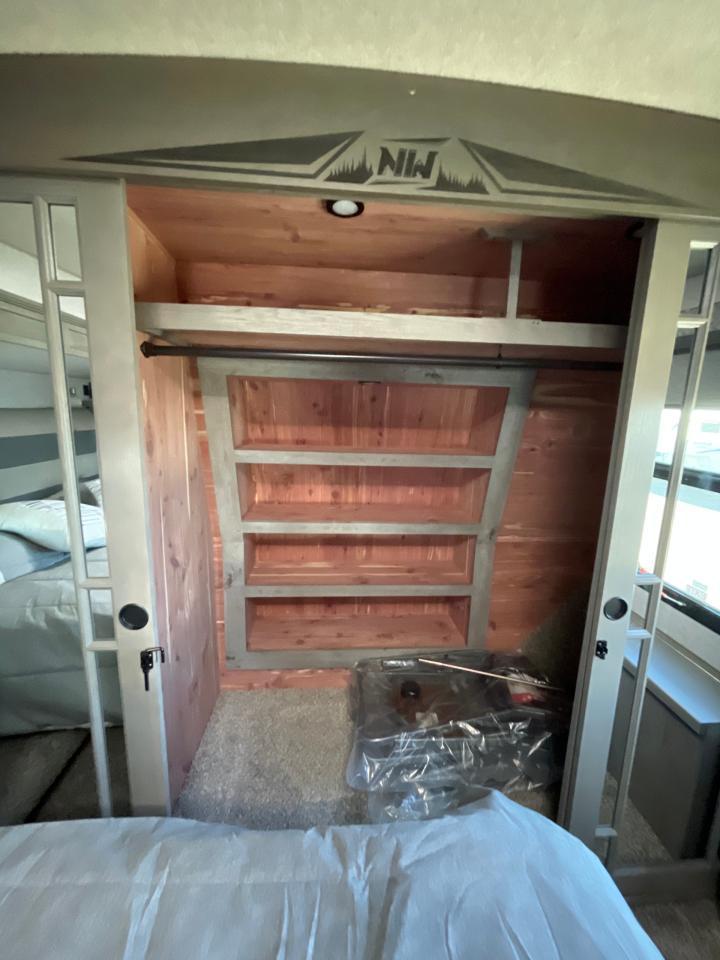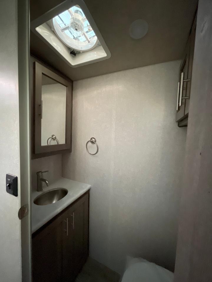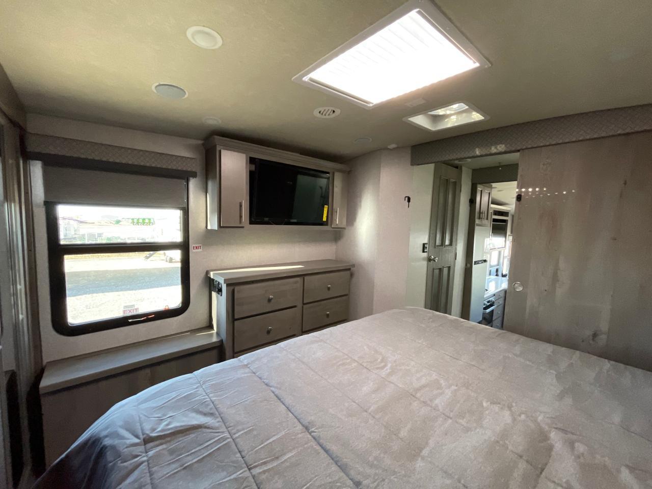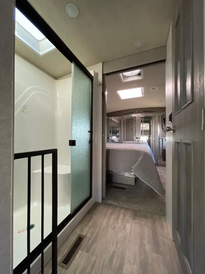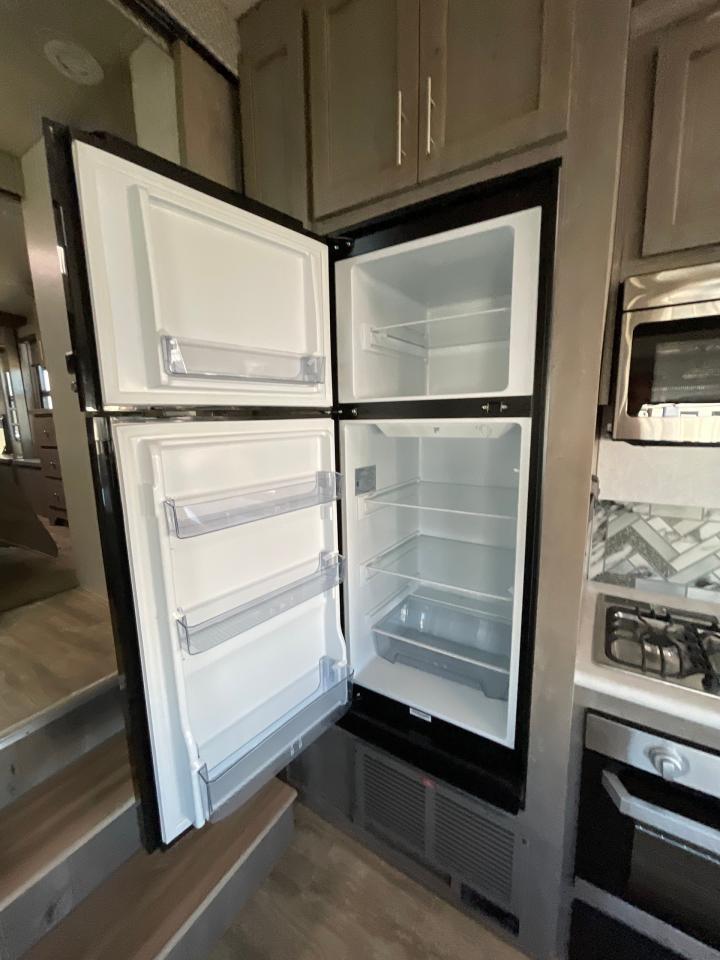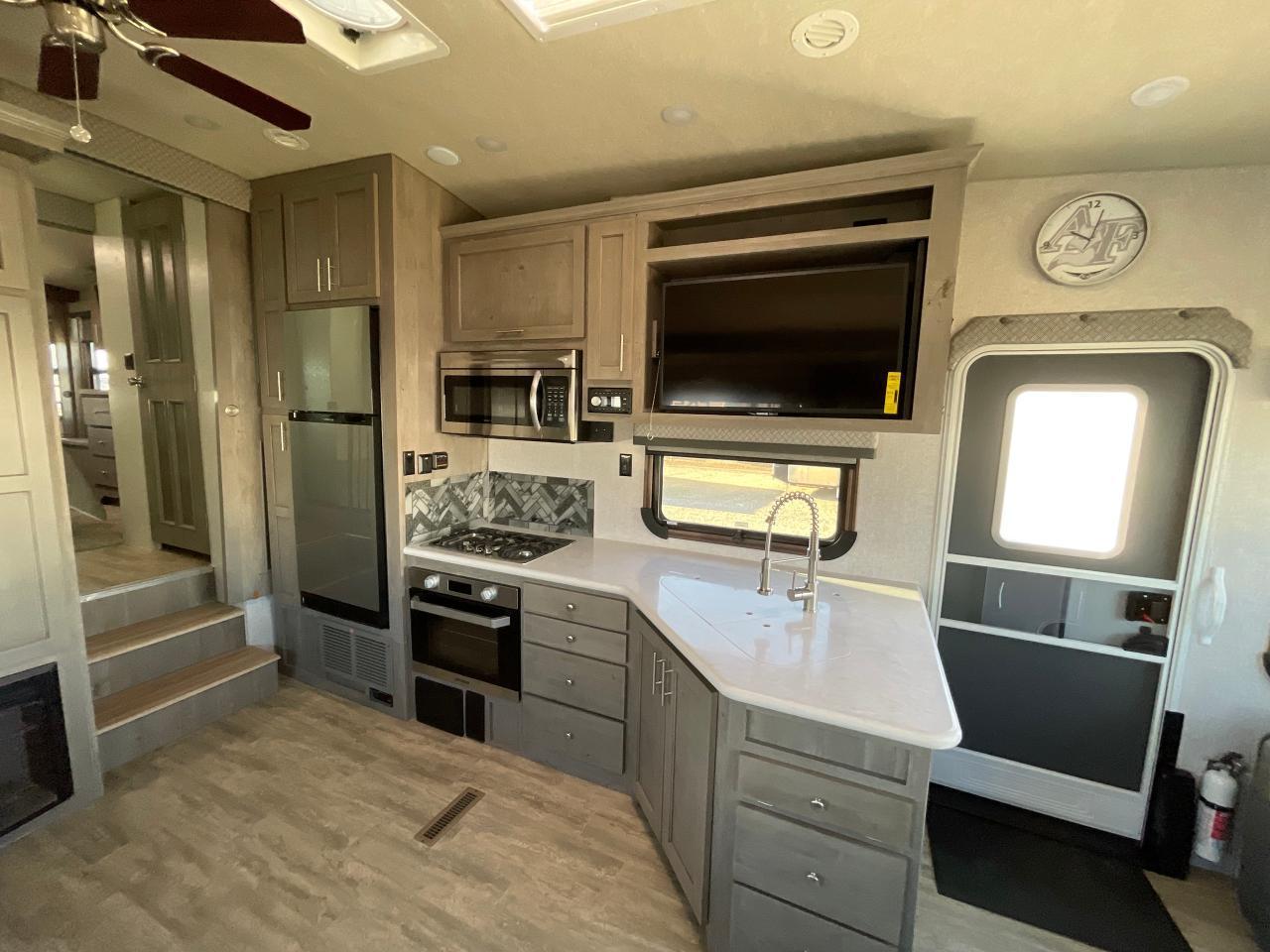 SolX4 400W Solar Package, 1.5 CuFt Convection Microwave, 12V Stainless Steel Refrigerator, Daylighter Kitchen Skylight, Lighted Toe Kick, Arctic Fox Clock and Door Mat, Ceiling Fan, 16 Gal Gas/Electric Water Heater, Coleman AC w/Digital Thermostat, 12V LED Awning, TV Antenna, Solid Surface Countertops, LED Smart TV, Furrion Cooking Suite, Fantastic Fan, Glass Shower Enclosure, TruRest Mattress w/Ultra Deck Sleep System, USB Charge Ports at Dinette and Bed.