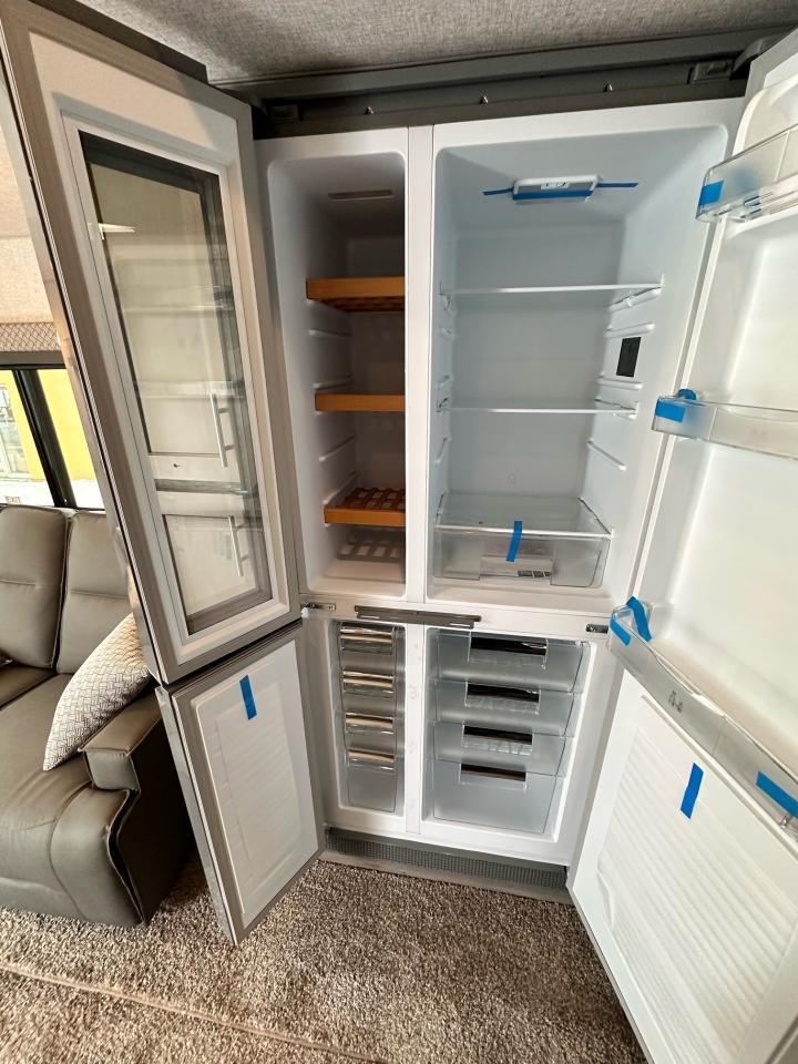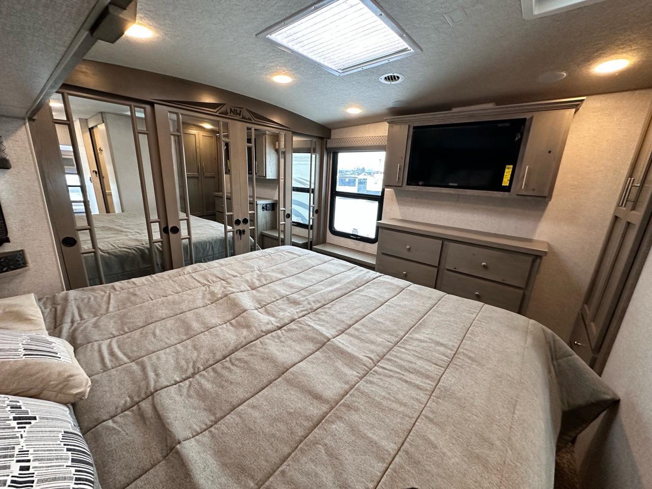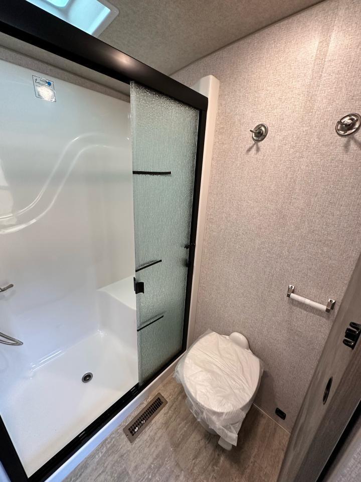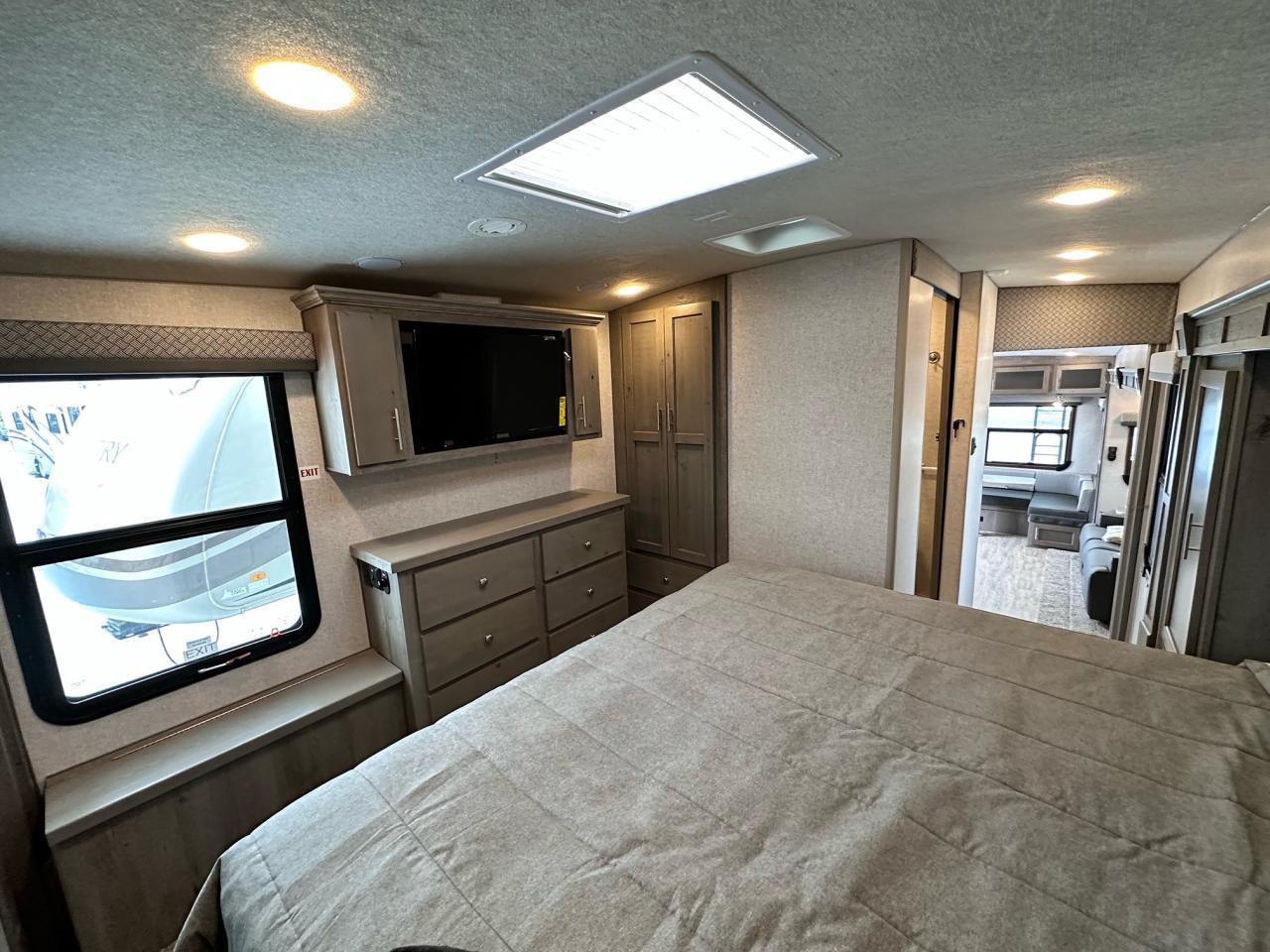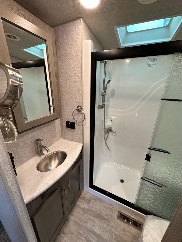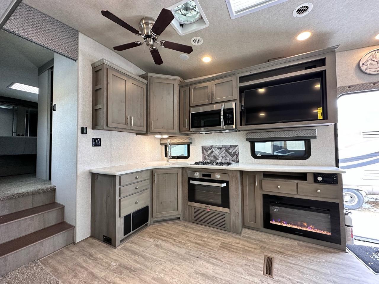 SolX4 400W Solar Package, 1.5 CuFt Convection Microwave, 12V Stainless Steel Refrigerator, Daylighter Kitchen Skylight, Lighted Toe Kick, Arctic Fox Clock and Door Mat, Ceiling Fan, 16 Gal Gas/Electric Water Heater, Coleman AC w/Digital Thermostat, 12V LED Awning, TV Antenna, Solid Surface Countertops, LED Smart TV, Furrion Cooking Suite, Fantastic Fan, Glass Shower Enclosure, TruRest Mattress w/Ultra Deck Sleep System, USB Charge Ports at Dinette and Bed.