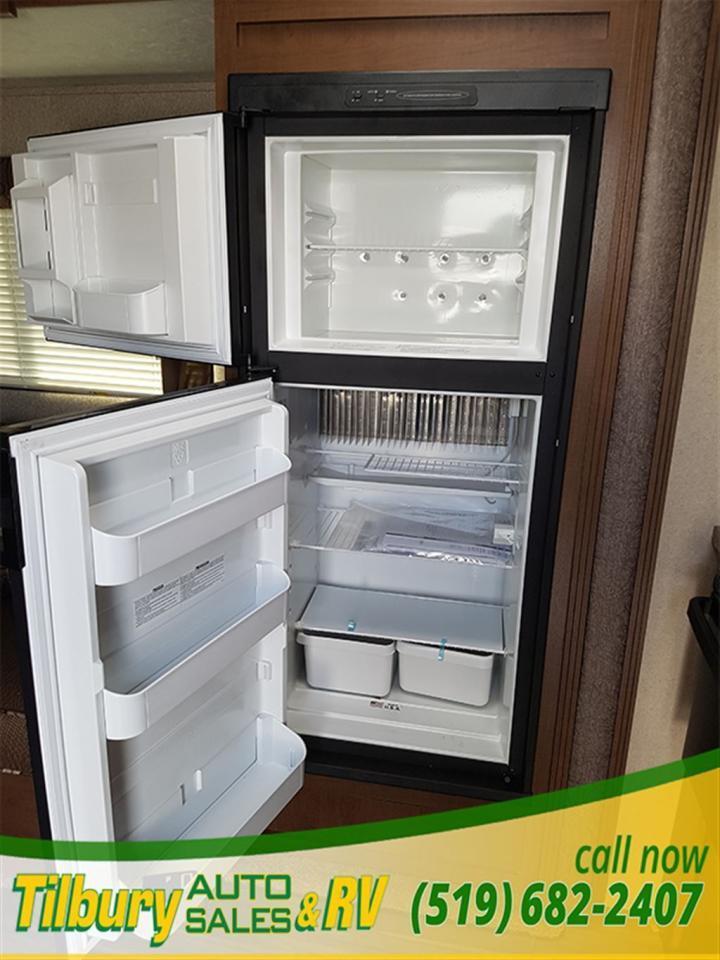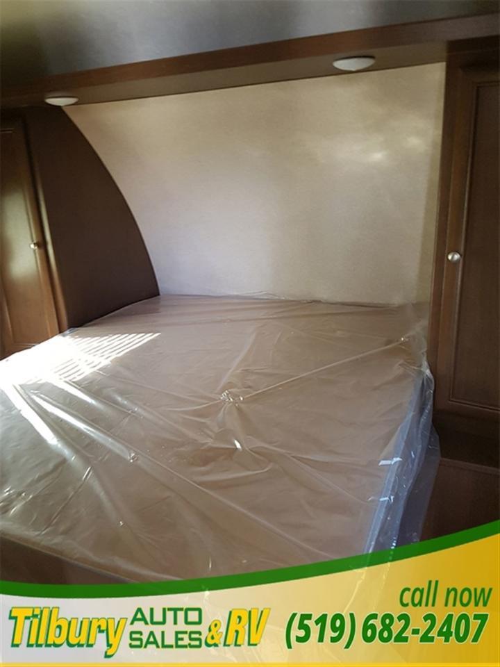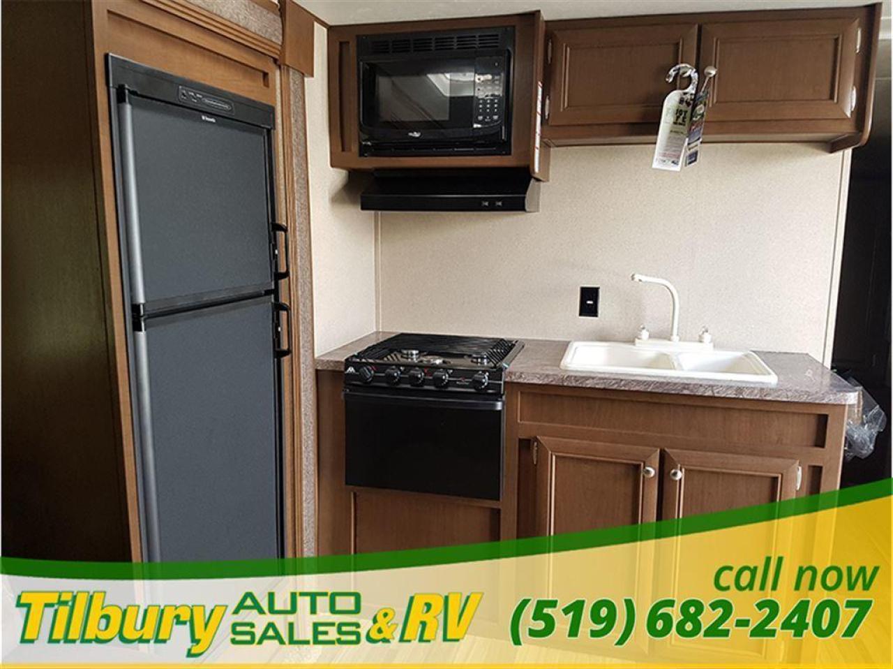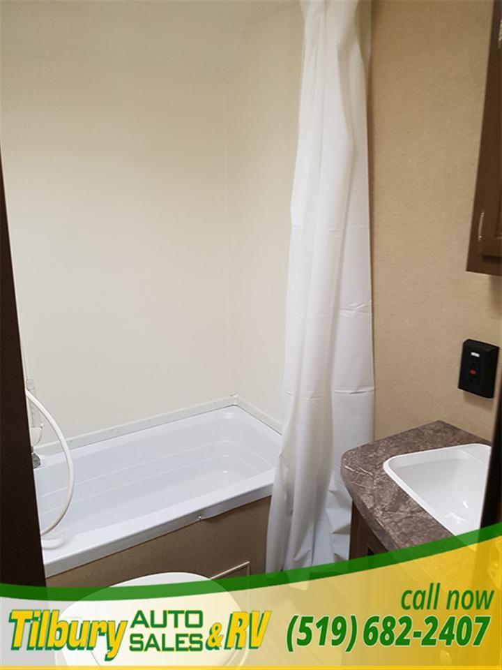 17 ft awning, power outlets, rock-guard, dual propane tanks. Inside you have a kitchen along the bedroom wall. opening up a mid living space. A dinette booth sits across from the sofa that folds into a bed. There is also a space to mount a TV. Towards the rear you will find double bunks and a rear bath with a shower / tub.