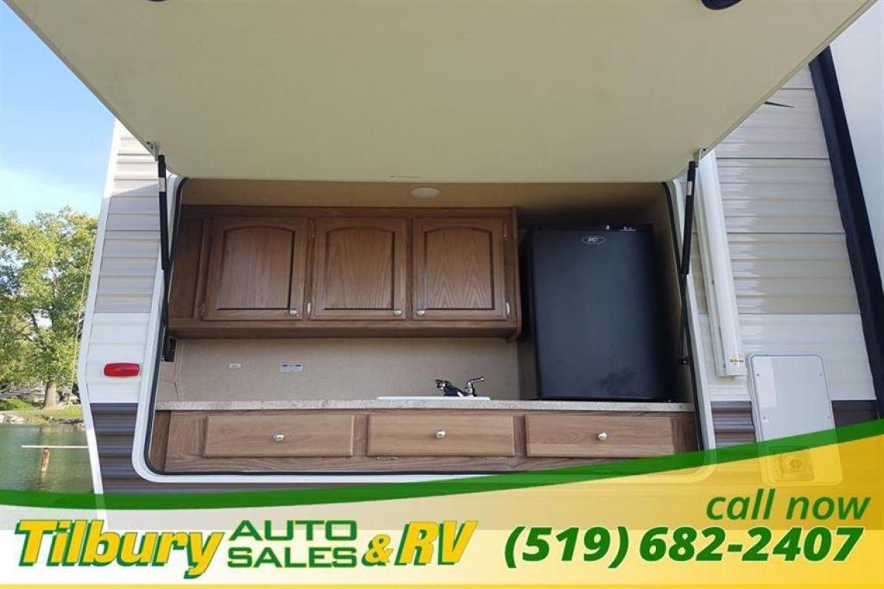 At the rear, a private bunkhouse is the perfect hang out for the kids! With a slide on one side including a 28"x74" upper bunk, and 38"x74" lower bunk, the floor space really opens up. You may choose an optional 42" dinette with a flip bunk that is perfect for game time, or maybe an optional 68" sofa with a flip bunk for relaxing would be better for your family. The choice is totally yours. Opposite the bunk slide you will find a closet and another 38"x74" bunk above storage with an outside kitchen below.