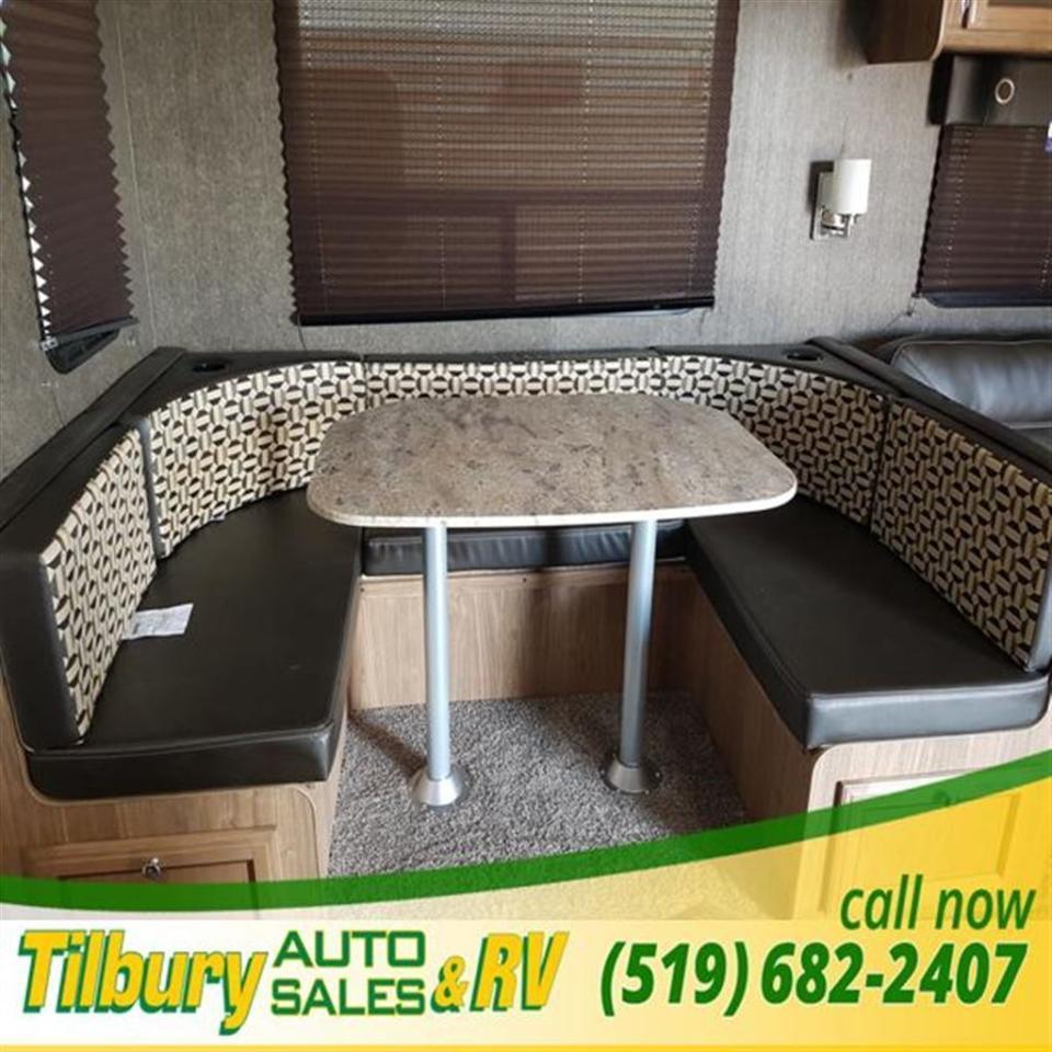 Across on the road side, a generous slide out provides a sofa, overhead cabinets, and a u-shaped dinette. You may choose an optional free standing table and chairs in place of the dinette if you like.