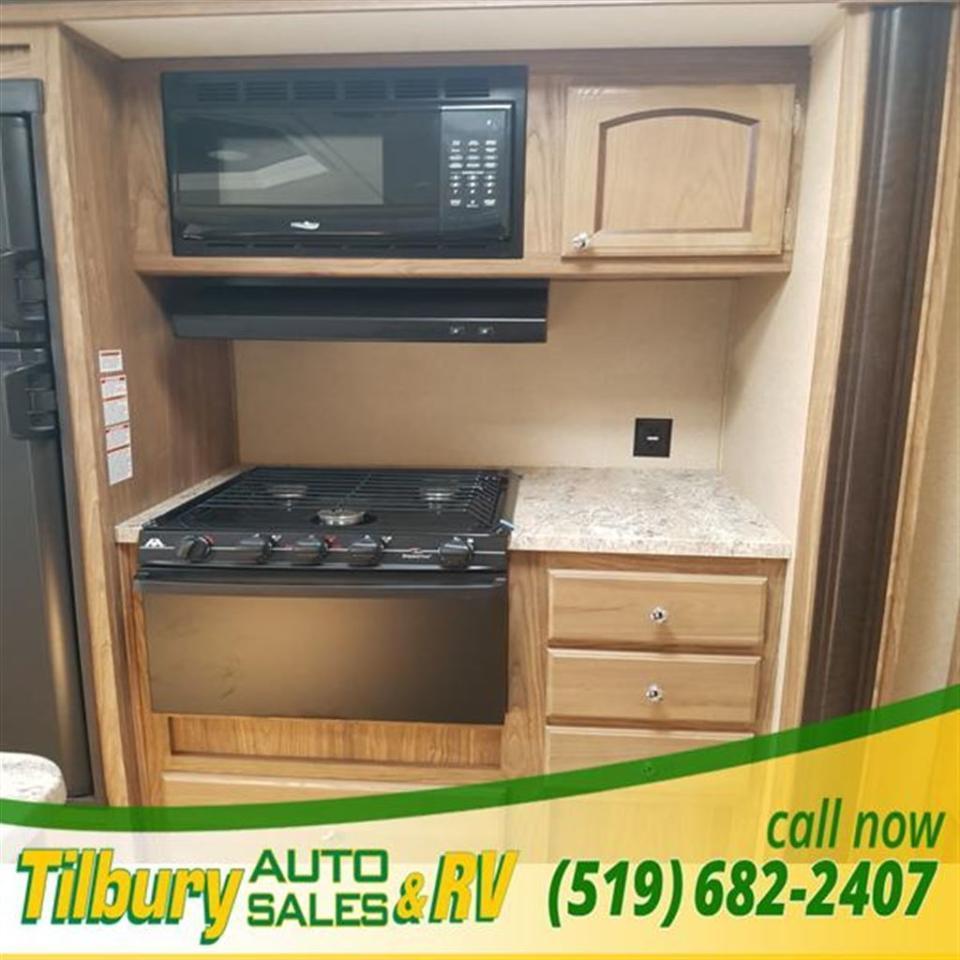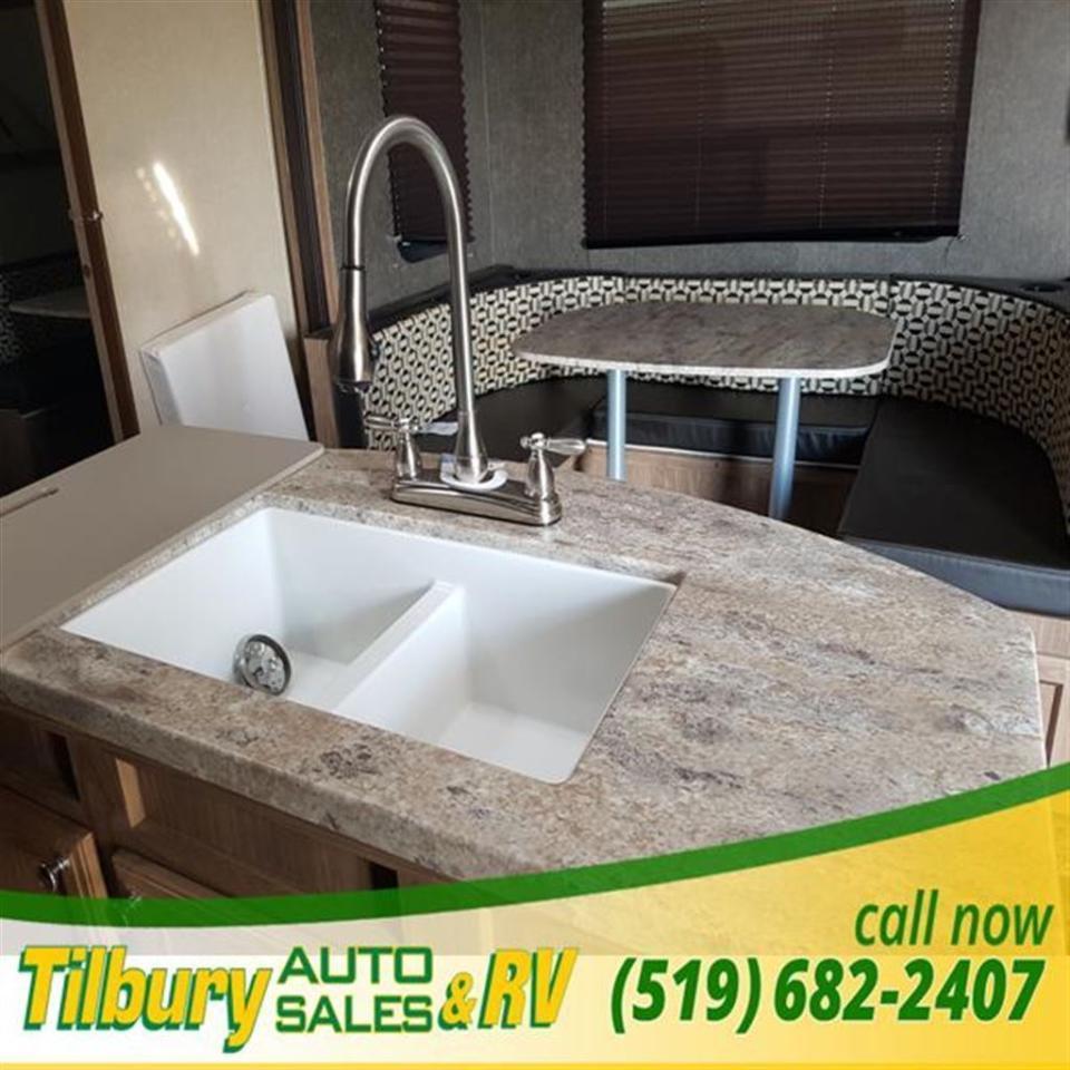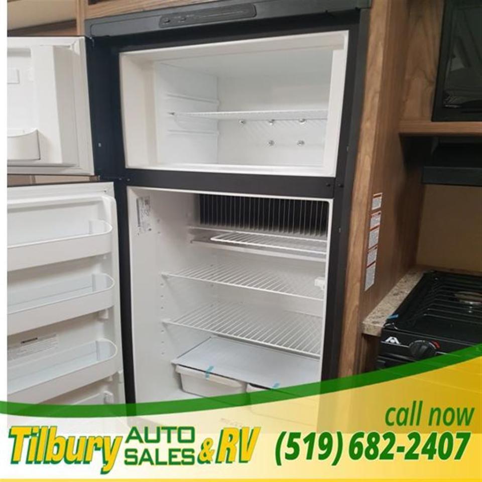 As you enter notice how open the combined kitchen and living space is thanks to the dual opposing slide outs. Immediately to the left of the entry door the kitchen slide provides an entertainment center, a refrigerator, and three burner range along with overhead cabinets. Just of the slide you will find a nice pantry for all of your dry goods. A kitchen island in the center includes a large sink for easy clean up and prep space.