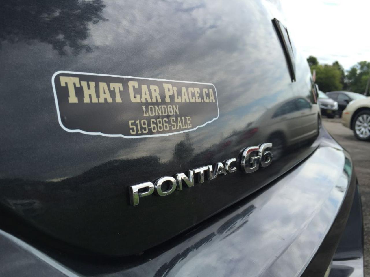 This 2009 Pontiac G6 SE is one slick fuel efficient car that comes nicely loaded with a great set of tires, BLUETOOTH, Remote Start, Sunroof, Power Driver Seat/Windows/Doors, Paddle Shifters, USB/AUX connectivity for your IPHONE/IPOD or ANDROID music playing device plus many more cool features. Call 1-519-686-7253 or Visit 443 Exeter Rd. That Car Place.Â