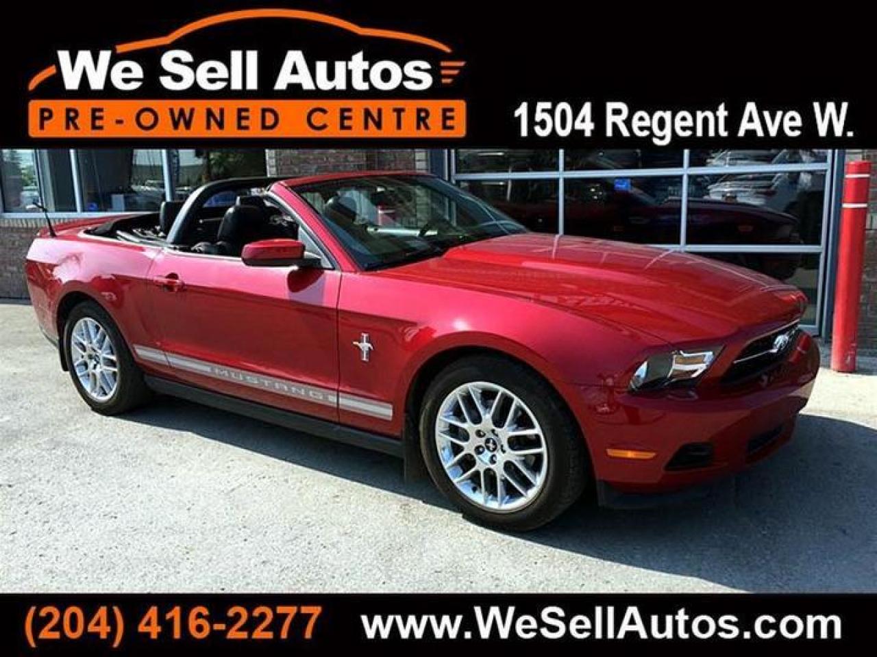 *Cash $23,988.00. Finance $22,988.00. At We Sell Autos we have over 400 pre-owned vehicles, and we guarantee the lowest prices in Manitoba!!! 2012 Ford Mustang Premium Convertible is equipped with Heated Leather Seats, Power Windows, Power Door Locks, and much more. All our vehicles have passed a Manitoba safety inspection and come with a FREE CarProof vehicle history report. Trade-ins welcome. Competitive finance rates with $0 down payment (OAC). View our entire inventory at www.WeSellAutos.com. Or come see us today at 1504 Regent Ave W. To book a test drive call (204) 416-2277. We Sell Autos - A Division of Donvito Automotive Group. Price does not include GST & PST. Dealer Permit #4612