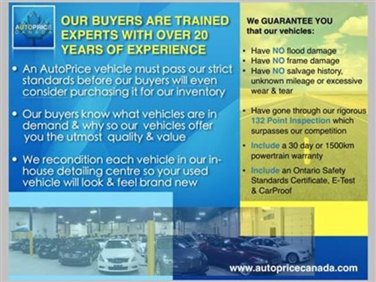 AutoPrice Canada is proud to serve the GTA including Mississauga, Toronto, Brampton and Oakville. With over 20 year's experience, we pride ourselves on providing every customer with VIP treatment! With no hassle pricing and on the spot financing we can get you into the vehicle of your dreams faster and at a better price than any of our competitors. We also welcome trade-ins and will buy your car or sell it for you. We guarantee that our vehicles are 100% free of liens and frame damage and for additional peace of mind, all of our vehicles are certified, emission tested and come with a 30 day /1500 km warranty. **TAXES AND LICENSING FEES ARE EXTRA** We are also there for you throughout the ownership of your vehicle. Our in-house 12 bay service centre offers everything from E-test machines to quick lube, from diagnostic machines to specialized high end vehicle equipment, we have it all and we have these services at discounted prices. Contact AutoPrice today - Canada's pre-owned vehicle superstore!