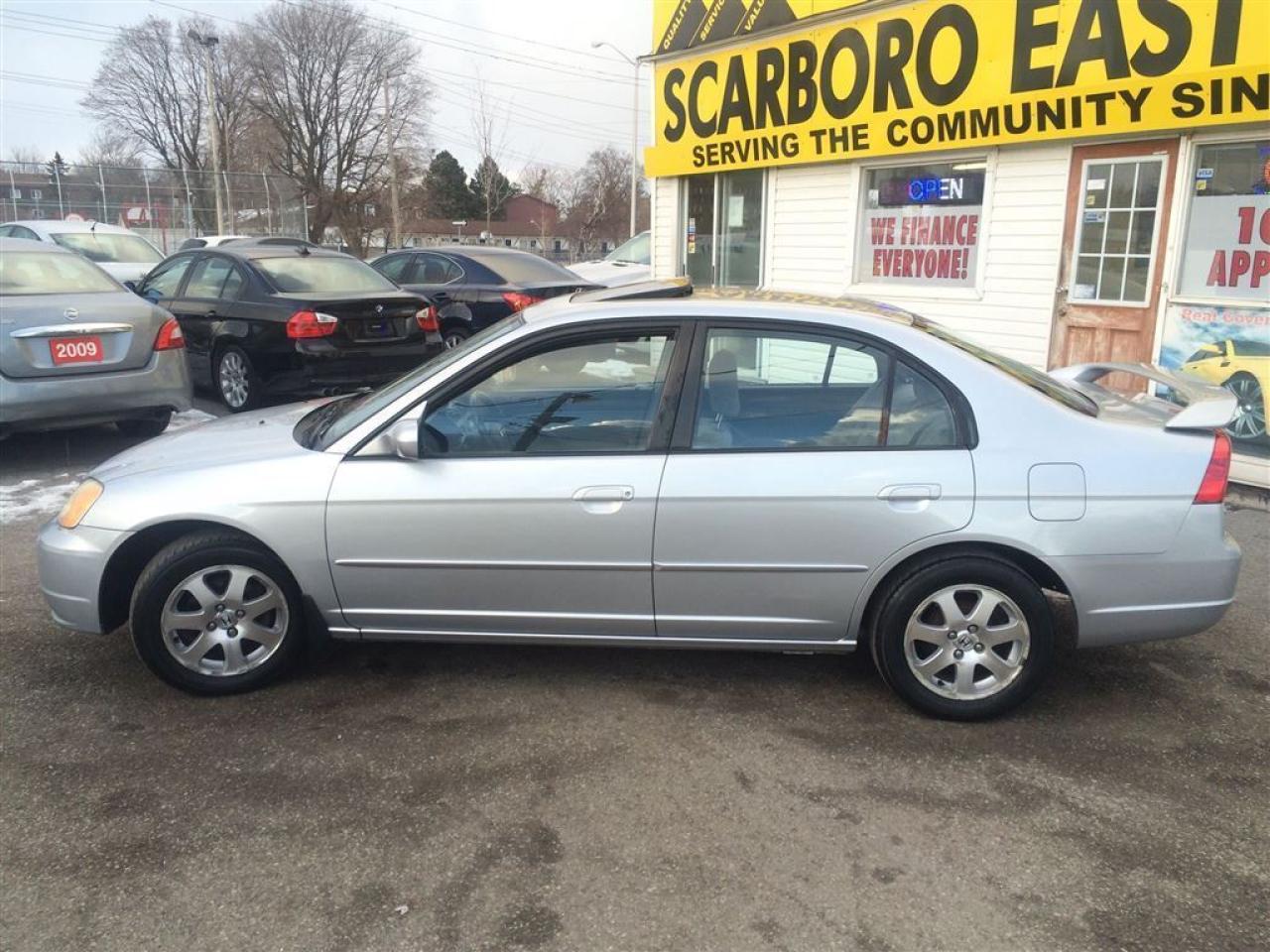 WE FINANCE EVERY ONE , 23 YEARS SERVING THE COMMUNITY,SAME LOCATION, SAME#4162870020 ------------------------------------------------------------------------------------------------------------------------------------ 4D , AUTO , FULLY LOADED WITH POWER MOON ROOF AND REAR SPOILER AS WILL AS THE ALLOY WHEELS , EQUIPPED WITH AIR CONDITION , SILVER EXTERIOR ON GREY INTERIOR , POWER WINDOWS , POWER DOOR LOCK , CRUISE CONTROL , TILT STEERING , POWER STEERING CONTROL , POWER MIRRORS , INTERIOR TRIMS AND MUCH MORE , FULLY LOADED , CLEAN CAR PROOF, LOCAL NEW CAR TRADE , LOOKS AND DRIVES LIKE NEW , 217000KMS BUT IT LOOKS LIKE 117000KMS ------------------------------------------------------------------------------------------------------------------------------------ PLEASE MAKE SURE ALL INFORMATION AND OPTIONS ( AIR CONDITION) ARE CORRECT AND WORKING PRIOR TO PURCHASE , ADVERTISING COULD HAVE MISTAKES (COPY &PAST) PLEASE READ ALL DOCUMENTATION ( HISTORY ) AND BILL OF SALE , DUC FEE $495 WILL APPLY IN FINANCE DEALS ------------------------------------------------------------------------------------------------------------------------------------ ALL FUNDS HAS TO BE CERTIFIED ONLY . *All Prices are unfit prices plus HST. Vehicle is not drivable if not certified and not E-tested. SAFETY AND E TEST ARE AVAILABLE FOR $695 WITH 36 DAYS SAFETY WARRANTY ON ALL THE SAFETY ITEMS ------------------------------------------------------------------------------------------------------------------------------------ At SCARBORO E AUTO LTD we try and make your dreams come true at www.scarboroeauto.ca Good credit, bad credit or no credit at all. Our team of finance managers have worked their magic arranging finance or a lease for many of scarboro e auto?s customers. scarbro e auto, used car and all makes certified used vehicle volume dealer is located in scarborough ( pickering boarder) 4663 Kingston roads. Just 2 lights east of morning side scarborough. Not far from pickering , Ajax, Whitby, Oshawa, Markham, Toronto, New market, Richmond hill, Thorn hill, Agincourt, Milliken, Malvern and much of the greater Toronto area or GTA. if you are looking for a used Honda civic, a used Honda , a used toyota , a used nissan, a used mazda, a used , a used suzuki, a used kia, a used subaru, a used ford,a used chevy,a used gmc, a used pontiac, a used buick, a used bmw , a used mercedes , a used vw , a used audi , a used van or truck. scarboro e auto is waiting for you with one of the largest inventories in the greater Toronto and Pickering area. scarboro e auto has a great selection of certified used vehicles. our certified used vehicles are listed in auto trader, Toronto?s kijiji and our own web site www.scarboroeauto.ca to be eligible as one of the oldest certified used car . scarboro e auto offer preferred finance rates, powertrain warranty, e tested, safety and certified. Come in or call us at 416 287 0020 and ask us about a used car , a used van, a used SUV. Do not wait for a Saturday sale to take advantage of one of the biggest selection of used low price cars, vans and used SUV's in Ontario. scaroboro e auto ltd is your best