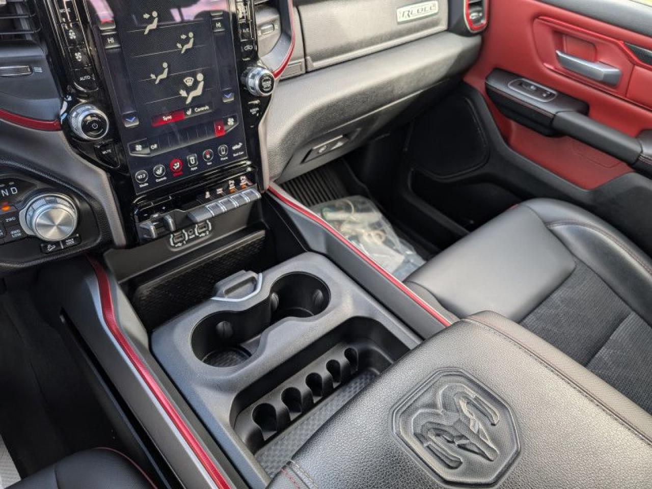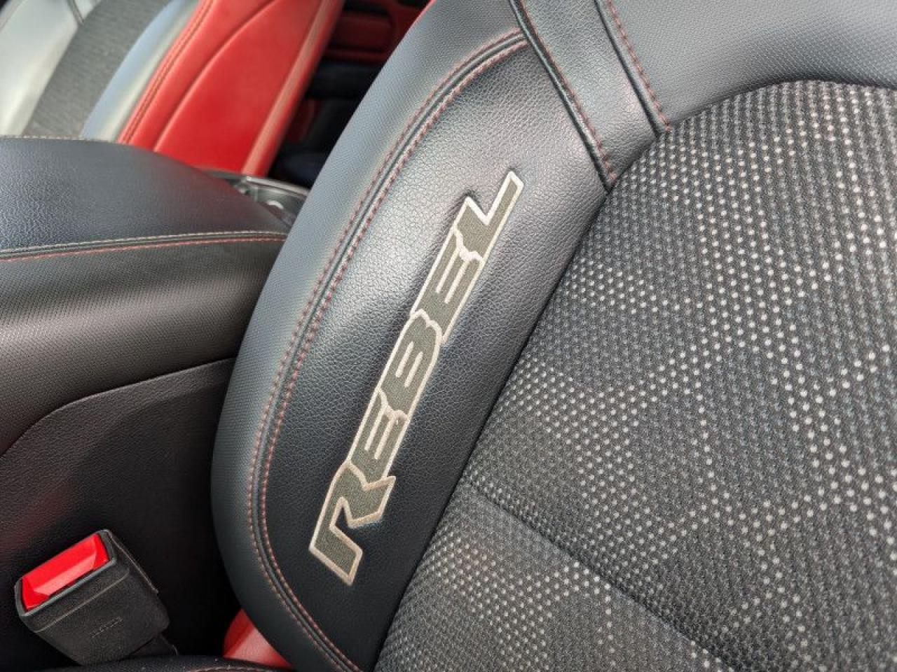 Our 1500's trim level is Rebel. This menacing Ram 1500 Rebel comes very well equipped with unique aluminum wheels, a sport performance hood, Bilstein off-road suspension with skid plates, Uconnect with a color touchscreen, wireless streaming audio, USB input jacks, and a handy rear view camera. This sweet pickup truck also comes with a power driver seat, a dampened tailgate, electronic shift-on-the-fly transfer case, hill decent control, power heated side mirrors, proximity keyless entry, cruise control, towing equipment, black bumpers with rear step, LED headlights and fog lights and much more. This vehicle has been upgraded with the following features: Off-road Suspension, Aluminum Wheels, Sport Performance Hood, Black Accents, Proximity Key, Touchscreen, Streaming Audio.