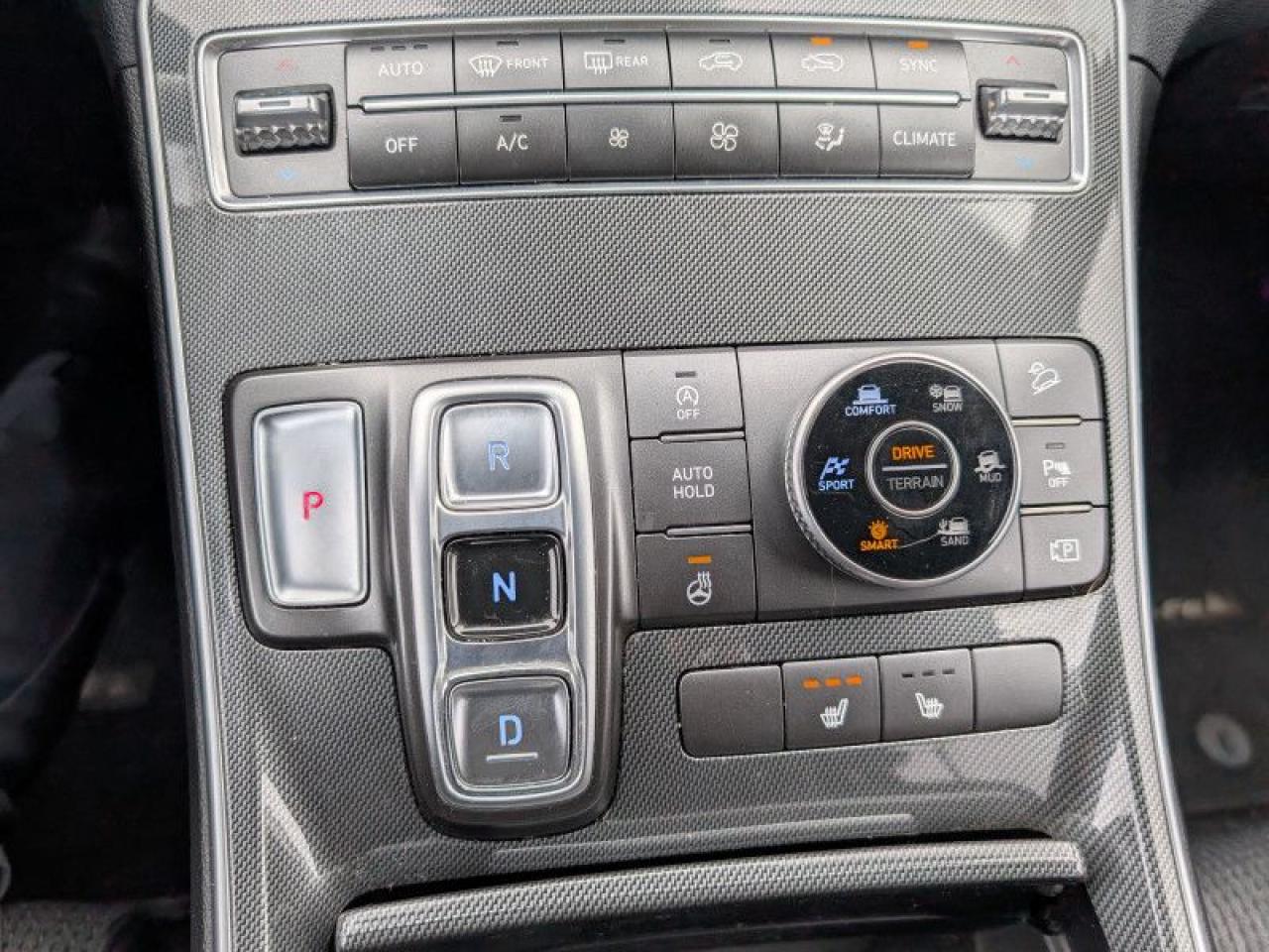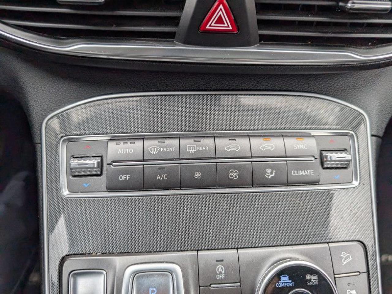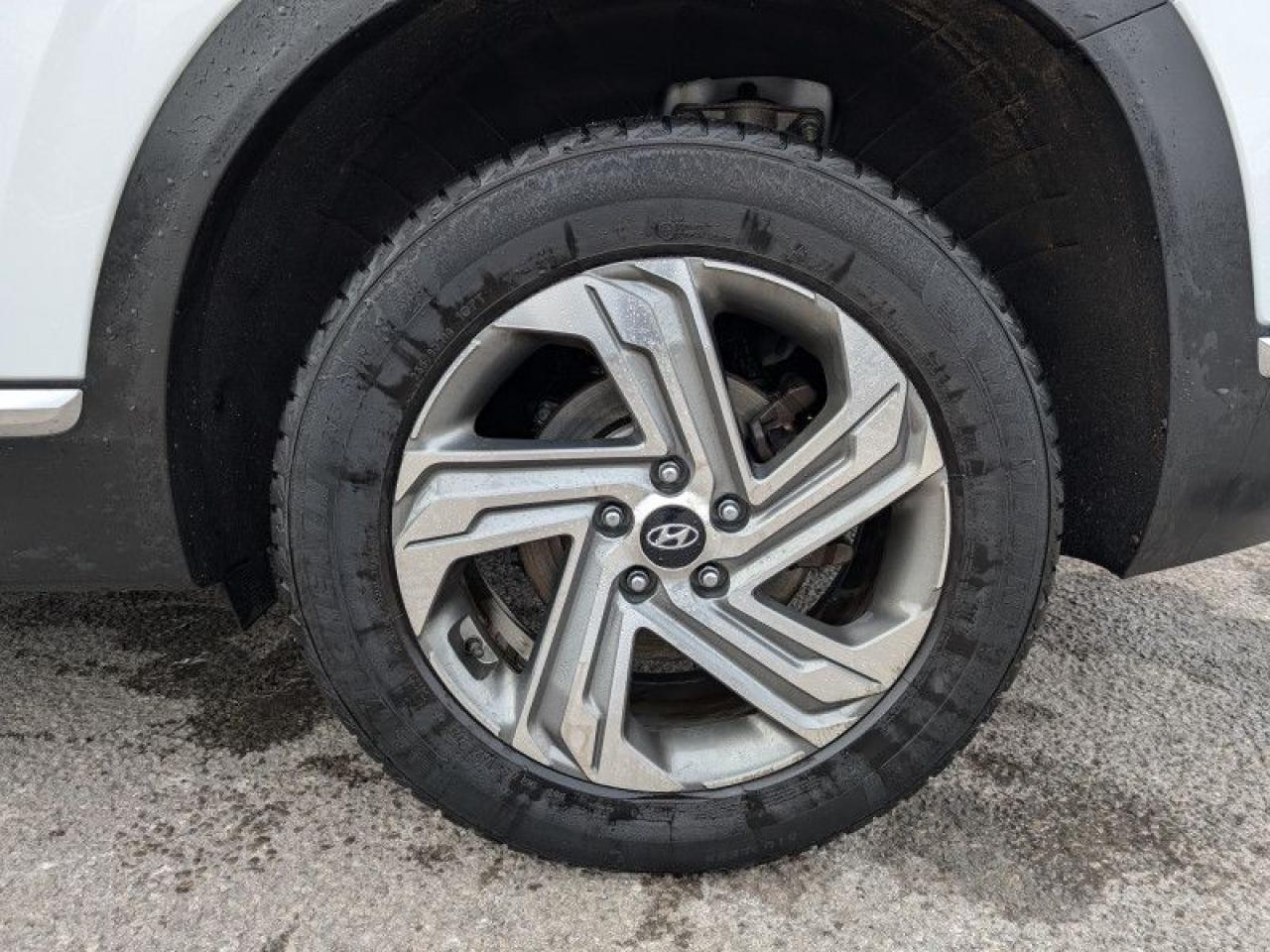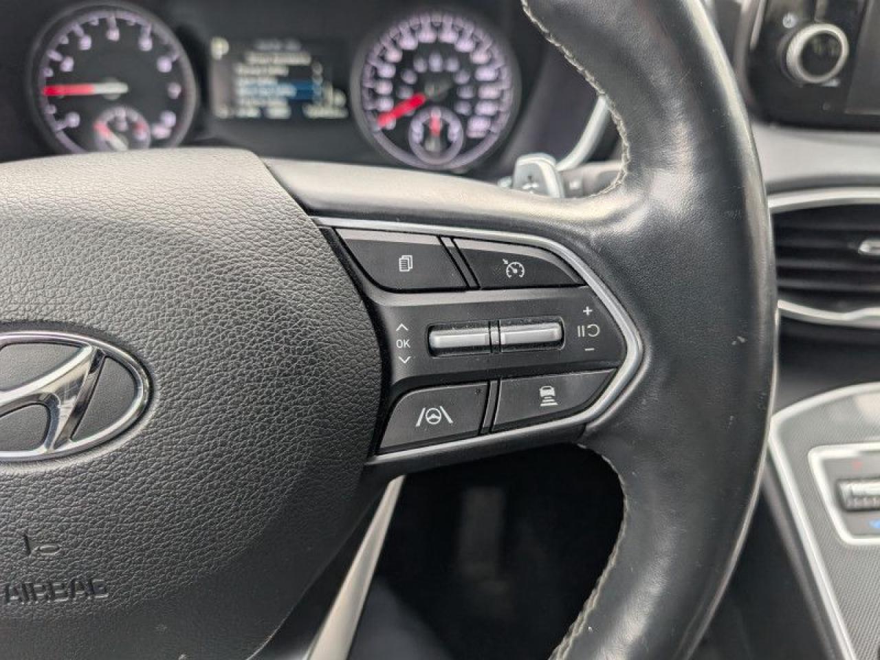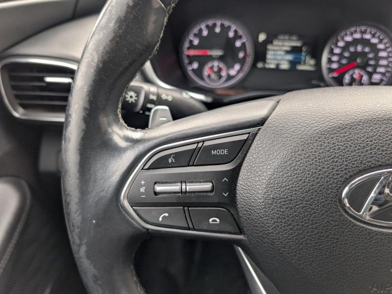 Our Santa Fe's trim level is Preferred AWD. This Santa Fe Preferred has all the driver assistance and safety features you could need with active blind spot and rear cross traffic assistance, parking distance assist, dual zone automatic climate control, proximity key entry. Other features include forward collision mitigation with pedestrian detection, adaptive cruise control with stop and go, lane keep assist, automatic high beams, a touchscreen, Android Auto, Apple CarPlay, heated seats and steering wheel, Bluetooth, automatic headlamps, LED accent lighting, drive mode select, and aluminum wheels