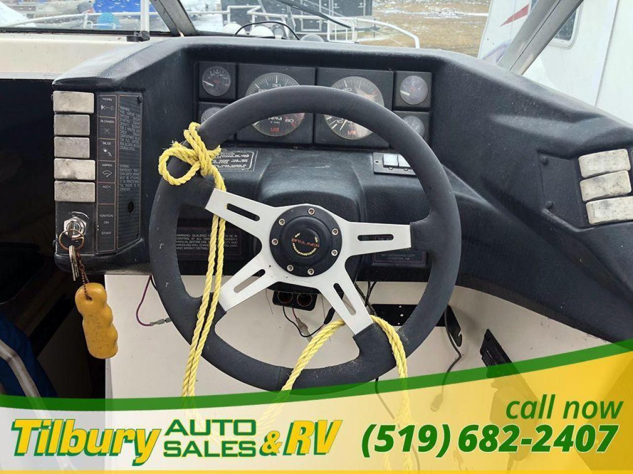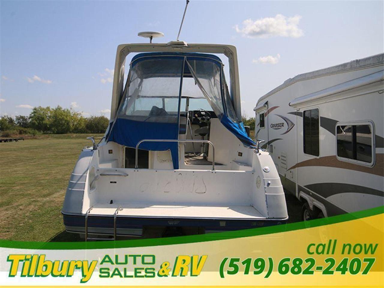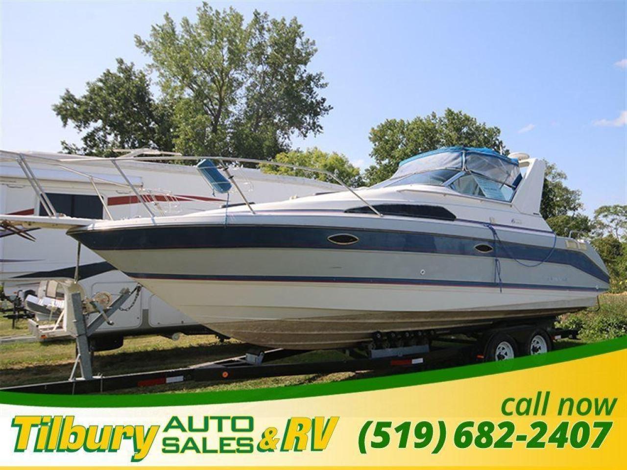 Enjoy cruising around on the lake in the 27 foot Bayliner sunbridge 2755. This boat does need a deep cleaning, but the potenital is quite clear to see. This boat can MOVE - with a 5.8 Ford Cobra Motor installed, you won't stay put in one place long. This comes with a bathroom, toilet, shower, 2 full sinks (one in the bottom and one on the top deck), and a mini fridge. Has an entertainment unit installed. Full seating underneath the boat (dinette kitchen area) that can be turned into a flat bed sleeping area. Tons of space under here - can comfortably stand if you're under 5'10. Tanning area in the front part of the boat. Canopy included for additional shade. 27 Feet long.
