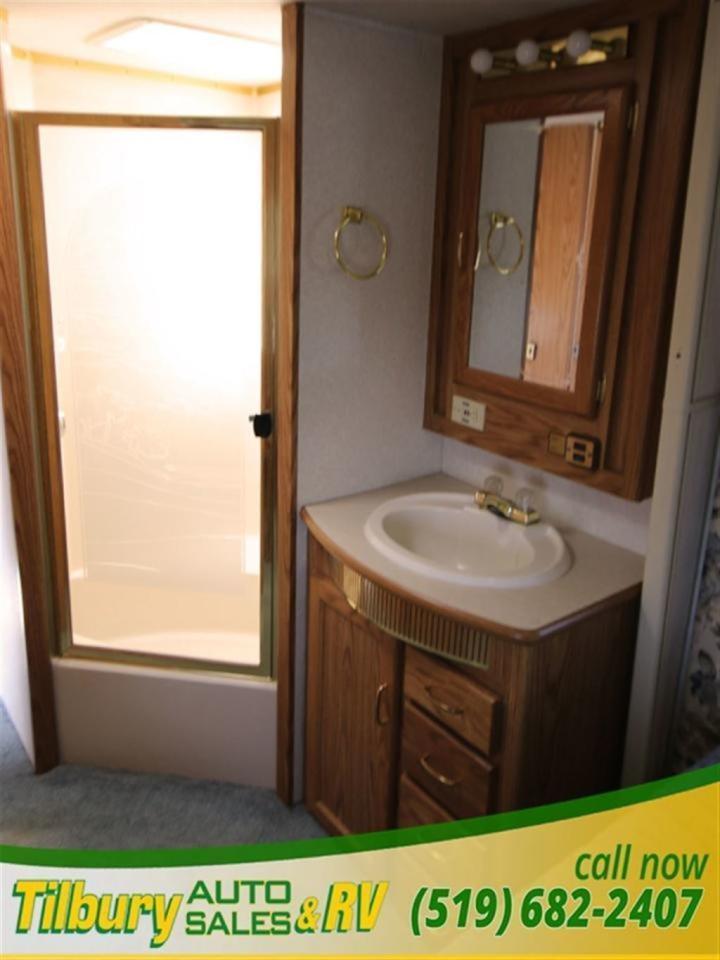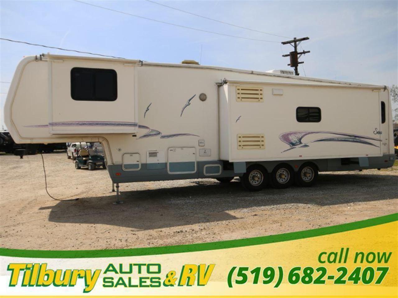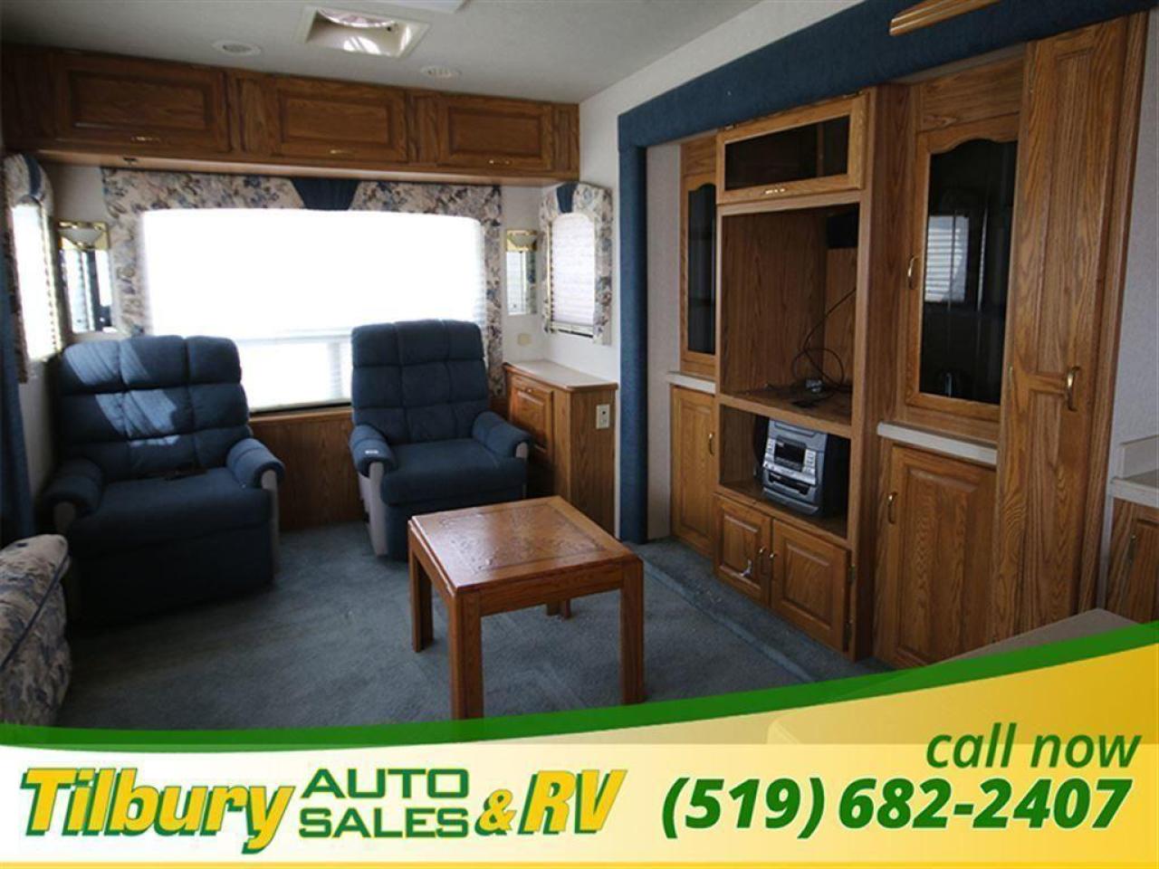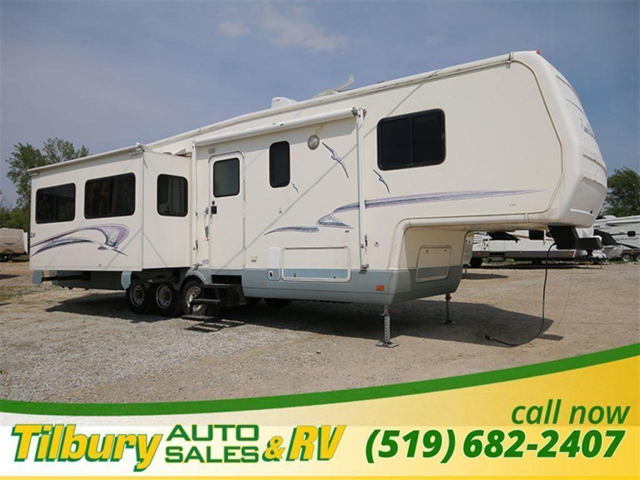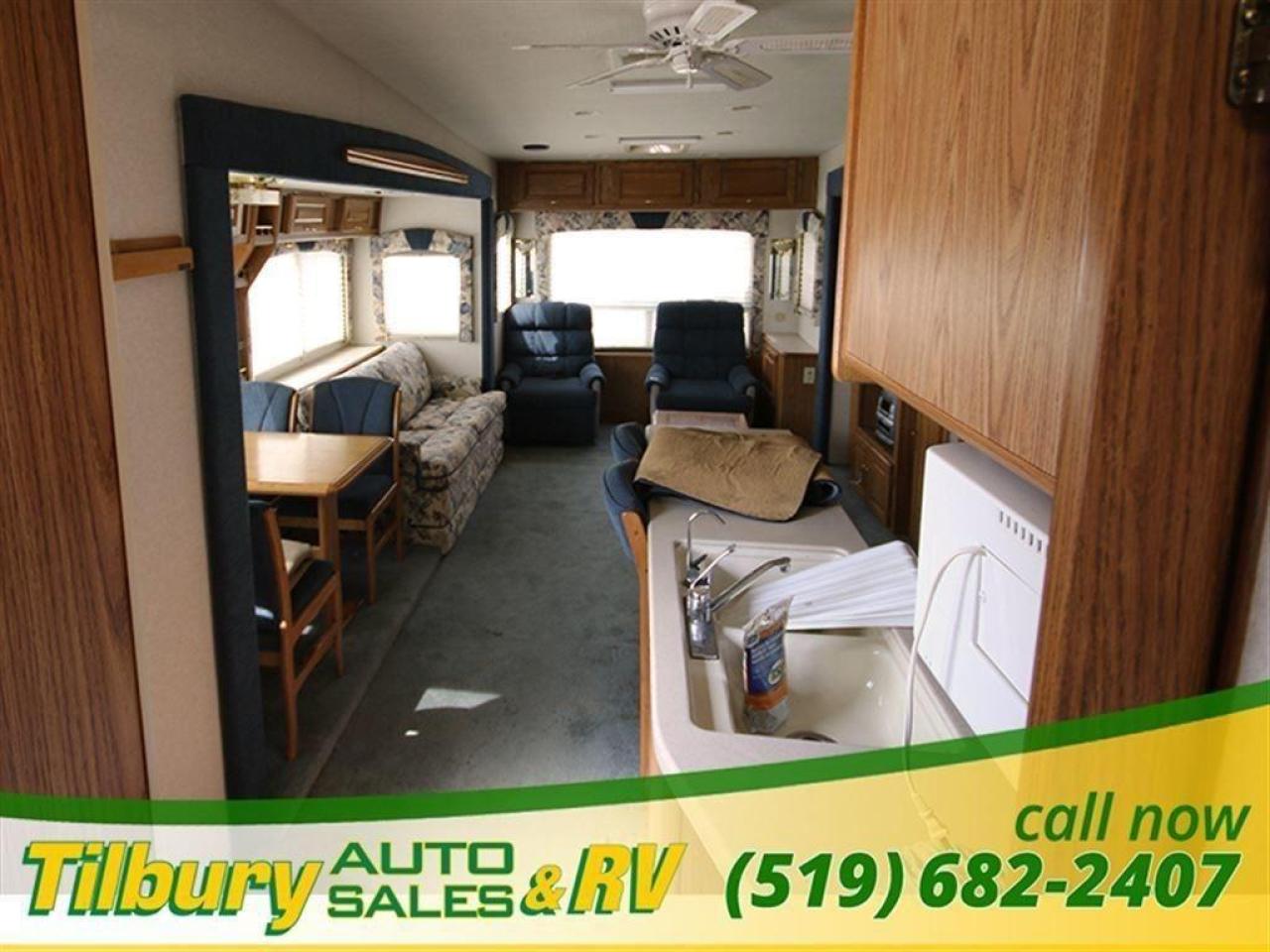 This 2000 National Seabreeze 5th wheel is very spacious - enough room for the whole family! Walk into the living area where you will find a kitchen with a nice sized island where the double sink is located, fridge. stove and microwave with plenty of cupboards and drawers, to the left there is a free standing dinette and four chairs.