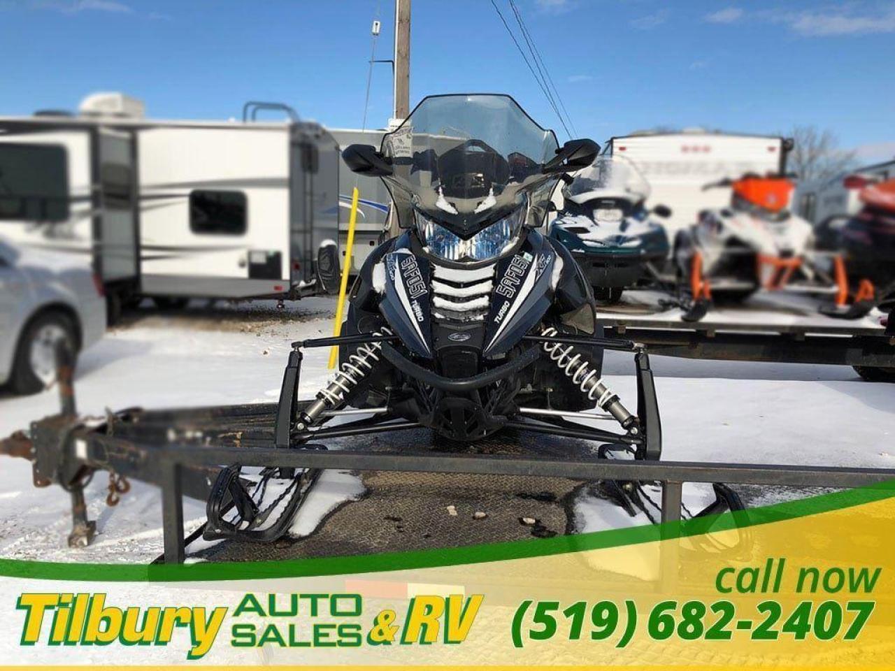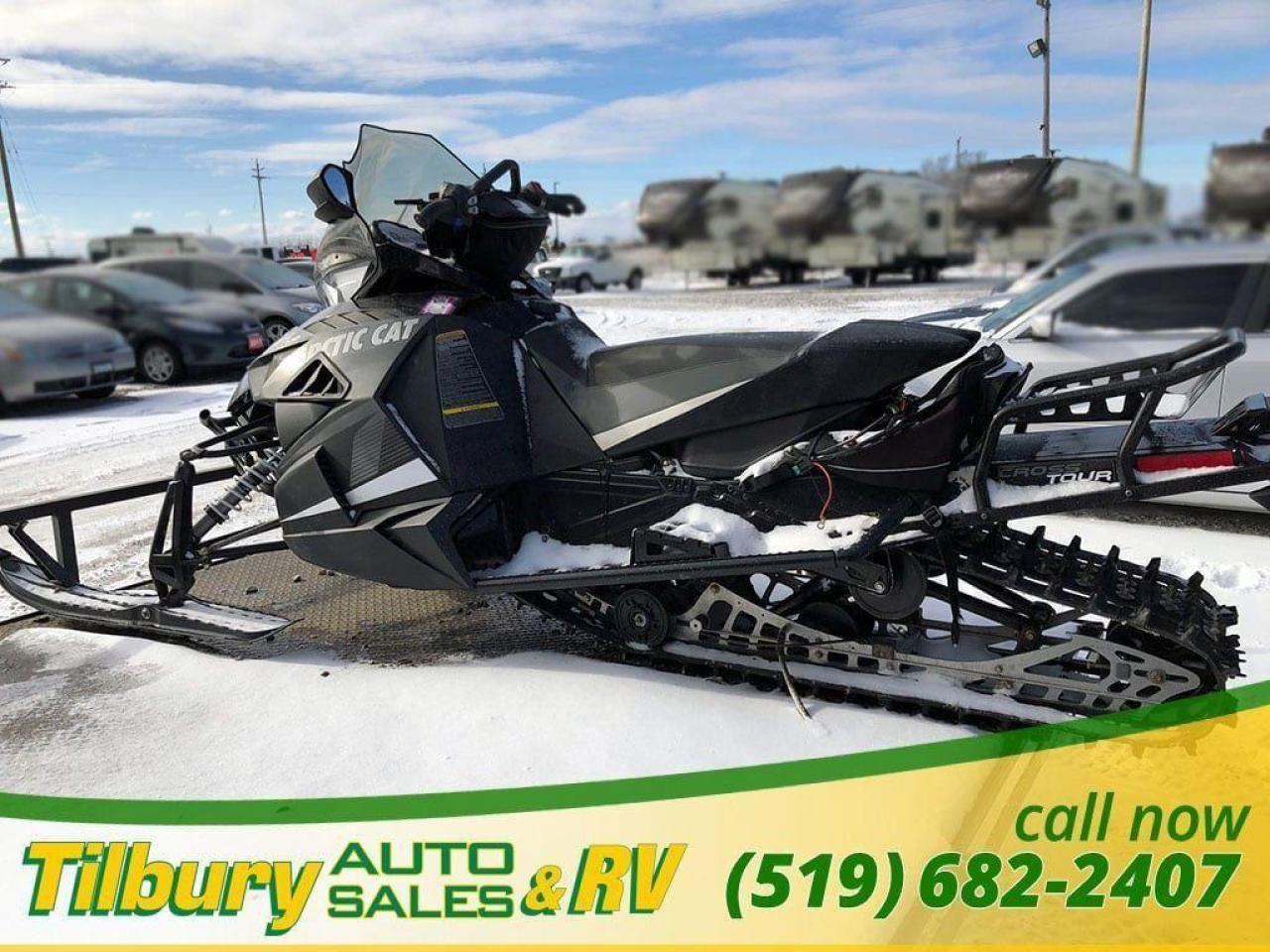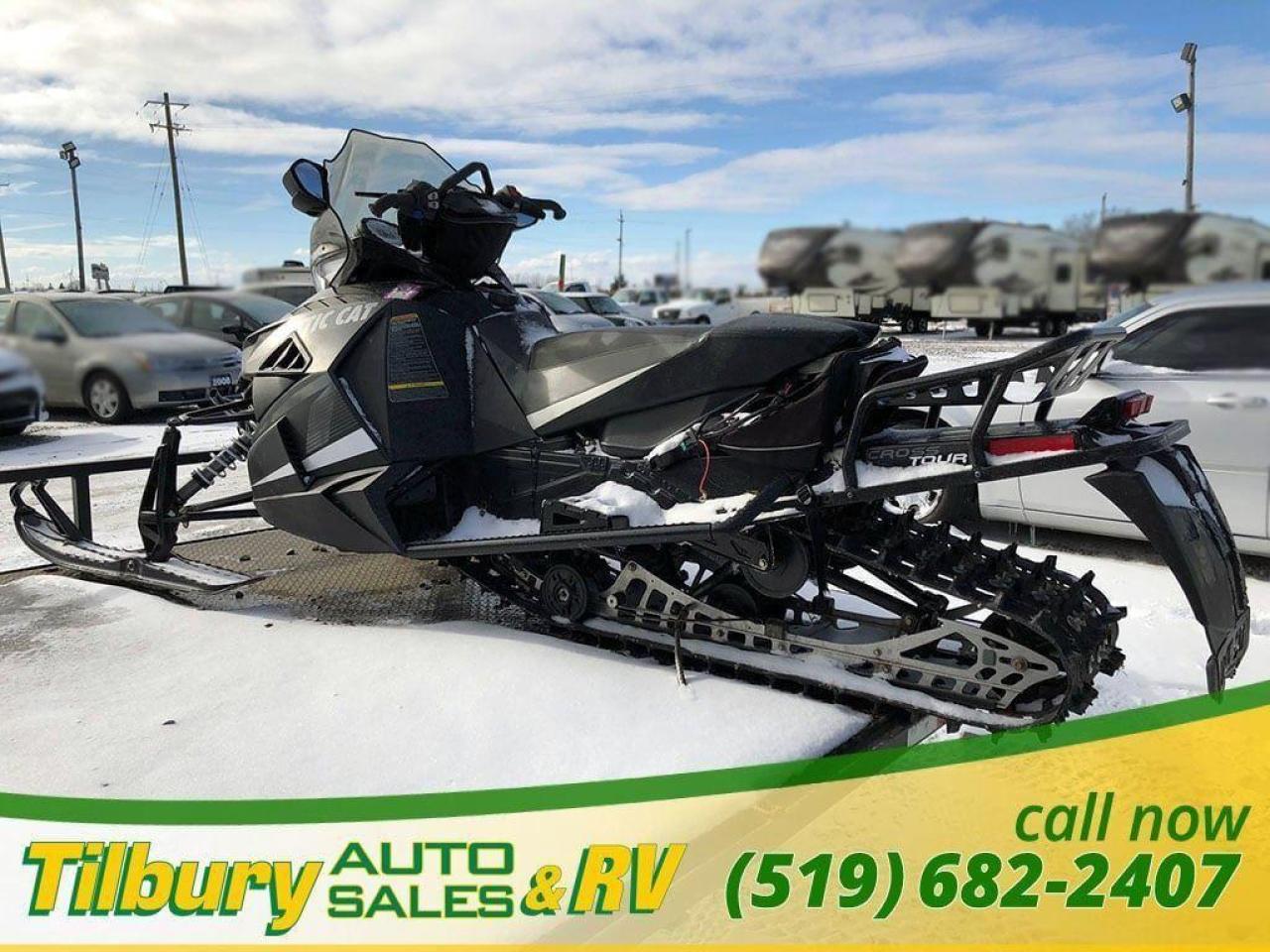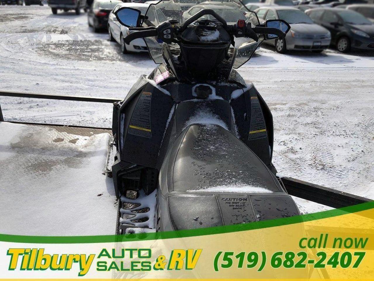 Call us at 519-682-2407 https://www.youtube.com/watch?v=dFgZCascafg Push-button reverse, dual halogen headlight (2-bulb), front sport bumper, heavy-duty MRP rear bumper, electric start, heated seat, adjustable handlebar, mid-height windshield, deluxe digital/analog gauge, electric gas gauge, low oil light, coolant overheat light, clock, altimeter, accessory outlet, high/low hand & thumb warmers, belt holder, mountain handlebar, rear storage bag, handlebar storage bag, cargo rack, mirrors, air pump. Length x Width 317.5 cm x 121.9 cm Ski Stance 106.7-109.2 cm adjustable Ski Type / Runner Mountain 15.2 cm/Dual skag w/carbide Track Type 38.1 cm x 358.1 cm Cobra / 3.2 cm