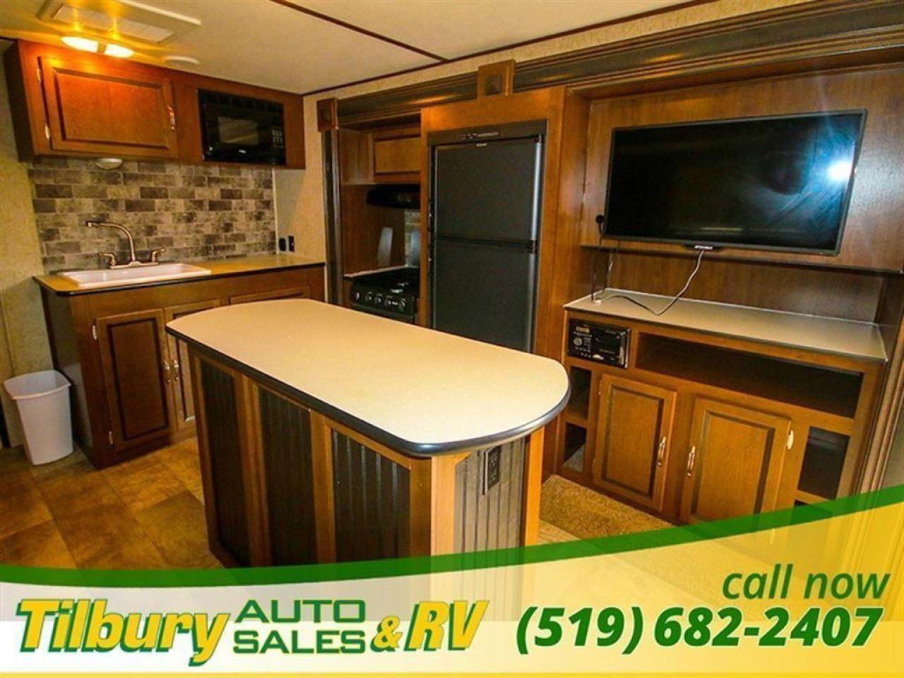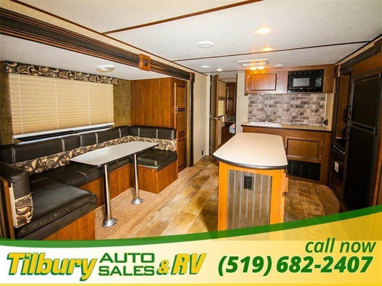 The U shaped dinette transfers into extra sleeping space or a couch, right across the trailer there is an entertainment center with a flat screen tv and built in stereo, the kitchen includes a center island, fridge/stove, cooktop/oven, microwave, and big tub sink.