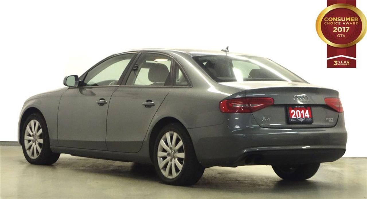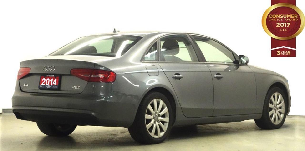 At Bell Auto our number one goal is to provided excellent customer service to all of our customers. We offer the lowest vehicle prices in the market in addition to best financial banks available to provide you with the lowest and most affordable interest rates & monthly payments. In addition, we have two certified mechanics and a mechanical shop, detailing and service department in the back of our dealership. Our customer relationship means the most to our company as we have been in business for 16 plus years, with a selection of inventory of over 200 vehicles. Come today to our spacious family environment showroom, or staff is delighted to meet all of you. You will have a pleasant shopping experience that is fun, informative, and never high pressured. Stop by our dealership or give us a call for more information. All vehicle's can be Safety Standards Certificate for an additional $399, if no Safety Standards Certificate then as per OMVIC Regulations the vehicle is deemed to be not drivable, no Safety Standards Certificate. Bell Auto is a OMVIC Dealership that has an A+ Rating on the Better Business Bureau, 3 Year winners of the Consumer Choice Awards for the Best Dealership In the G.T.A. and Surrounding Areas, The Readers Choice Award Winners for Detailing, Over All Dealership, Import Dealership and Used Car Dealership. Step into the 2014 Audi A4! First and foremost is the striking exterior. This 4 door, 5 passenger sedan still has less than 120,000 kilometers! Audi prioritized practicality, efficiency, and style by including: leather upholstery, telescoping steering wheel, and the power moon roof opens up the cabin to the natural environment. Under the hood you'll find a 4 cylinder engine with more than 200 horsepower, and for added security, dynamic Stability Control supplements the drivetrain. We pride ourselves on providing excellent customer service. Stop by our dealership or give us a call for more information.