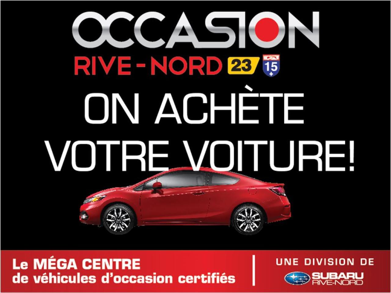 JAMAIS ACCIDENTÉ! Un seul propriétaire! Repris en échange d'un de nos client, ne provient pas de l'encan. INSPECTION SÉCURITAIRE FAITE! Pour une conduite en toute sécurité, digne dun vrai concessionnaire de confiance. Conditions en succursale. ACCIDENT FREE! One owner! Trade in, not an auction vehicle. SAFETY INSPECTION DONE! For safe driving, worthy of a real dealer of confidence. Conditions in store. 2012 Golf R. Manuelle, Système de navigation, Bluetooth, Intérieur en cuir, Toit ouvrant, Jantes en alliage, Phares antibrouillards, Sièges électriques, Air climatisé, Lecteur CD/MP3/AUX/USB, Anti-patinage, Très bien équipé et Très propre! Kilométrage vérifié. Garantie supplémentaire disponible. Mécanique et esthétique WOW! Conditions en succursale! 2012 Golf R. Manuel, Navigation system, Bluetooth, Leather interior, Sunroof, Alloy wheels, Fog lights, electric seat, Air conditioning, PowerGroup, CD/MP3/AUX/USB, Traction control, Very well equiped and Very ! Verified mileage. Additional warranty available. Mechanically and aesthetically WOW! Conditions in store! PLUS DE 200 VÉHICULES DOCCASION EN INVENTAIRE. Nos hauts standards de qualité, un très large inventaire, le meilleur rapport qualité/prix et une approche sans pression font de Subaru Rive-Nord et Occasion Rive-Nord des valeurs sûres pour lachat de votre prochain véhicule doccasion! MORE THEN 200 PRE-OWNED VEHICLES IN STOCK. Our high quality standard, a very large inventory, best quality/price ratio and no pressure approach make Subaru Rive-Nord and Occasion Rive-Nord a safe bet for the purchase of your next pre-owned vehicle! WWW.SUBARURIVENORD.COM