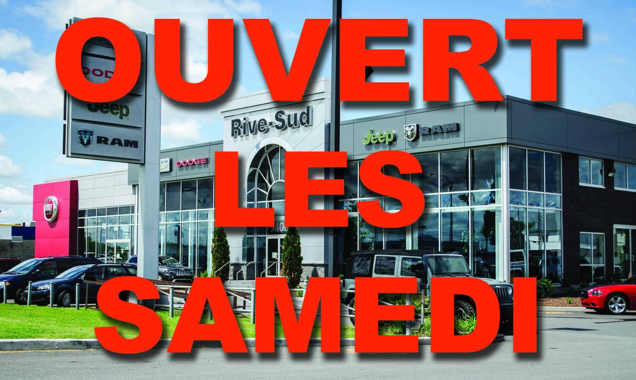 Rive-Sud Chrysler, le seul concessionnaire Chrysler/Dodge/Jeep/Ram/Fiat dans la région à vous offrir la chance de gagner votre achat jusqu'à concurrence de 50 000$. Laissez-nous le plaisir de vous servir dans un environnement des plus conviviales en vous offrant différentes solutions qui répondront à vos besoins. Nous offrons la 1ere, 2e et 3e chance au crédit. Rapport Carproof disponible sur tous nos véhicules en inventaire. Vous ne trouvez pas le véhicule convoité? Appelez-nous et laissez-nous trouver votre prochain véhicule! Rive-Sud Chrysler, VIVEZ, RÊVEZ, ROULEZ!