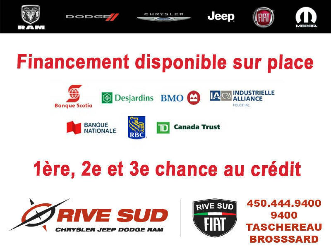 Rive-Sud Chrysler, le seul concessionnaire Chrysler/Dodge/Jeep/Ram/Fiat dans la région à vous offrir la chance de gagner votre achat jusqu'à concurrence de 50 000$. Laissez-nous le plaisir de vous servir dans un environnement des plus conviviales en vous offrant différentes solutions qui répondront à vos besoins. Nous offrons la 1ere, 2e et 3e chance au crédit. Vous ne trouvez pas le véhicule convoité? Appelez-nous et laissez-nous trouver votre prochain véhicule! Rive-Sud Chrysler, VIVEZ, RÊVEZ, ROULEZ!