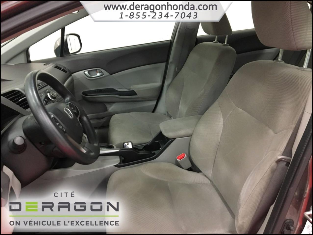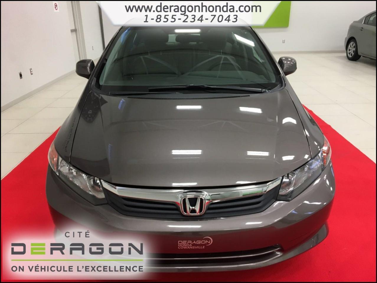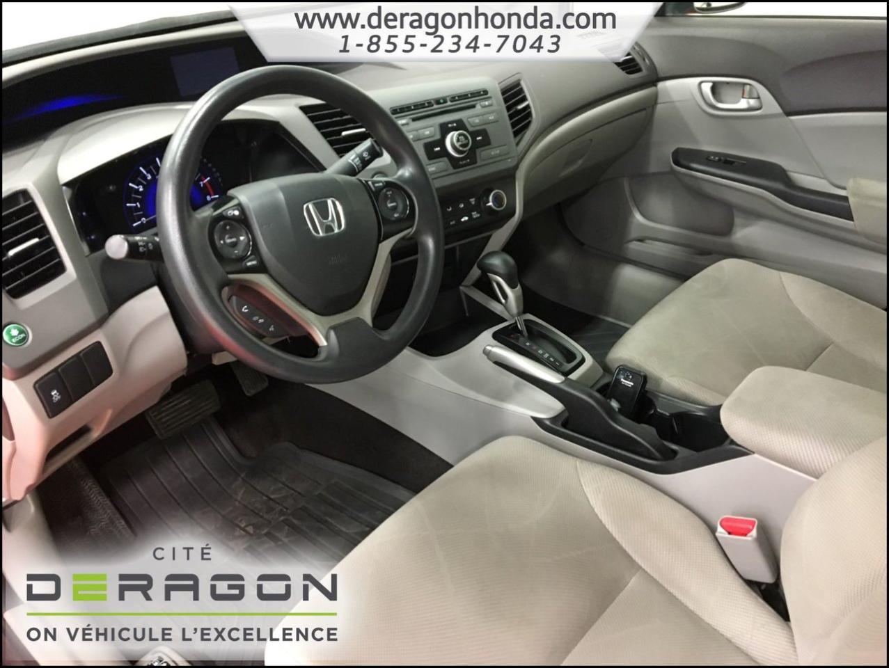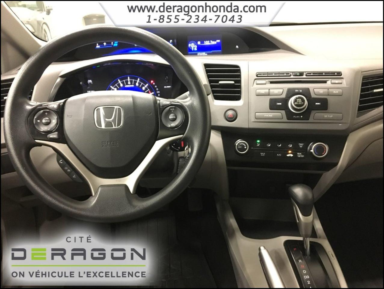 Honda Civic LX 1.8L + A/C + BLUETOOTH + D?MARREUR ? DISTANCE LX 1.8L+A/C+BLUETOOTH+D?MARREUR ? DISTANCE+R?GULATEUR DE VITESSE 2012Régulateur de vitesse, Essuie-glaces intermittents, Anti-démarreur, Freins ABS, Contrôle de stabilité, Coussin gonflable conducteur, Coussins gonflables latéraux, Démarreur à distance, Lecteur CD, Lecteur MP3, Tachymètre, Vitres électriques, Air climatisé, Commandes audio au volant, Lampes de lecture arrière, Volant ajustable, Enjoliveurs, Tapis protecteurs, Radio AM/FM, Phares automatiques, Rétroviseur électrique, Direction assistée, Télédéverrouillage, Rétroviseurs chauffants, Coussins gonflables arrière pour la tête, Sièges tissu, Freins à disque, Rétroviseurs électriques, Antipatinage, Verrous de sécurité pour enfants, Sièges baquets, Technologie Bluetooth intégrée, Climatisation