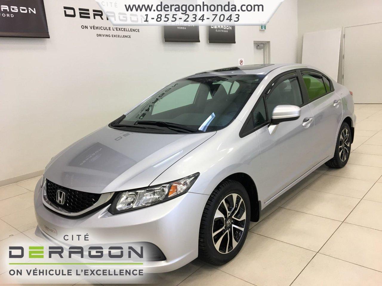 Honda Civic EX+D?MARREUR ? DISTANCE+TOIT OUVRANT+BLUETOOTH EX+BAS KILO+D?MARREUR ? DISTANCE+TOIT OUVRANT+VITRE TEINT?ES+SI?GES CHAUFFANTS+CRUISE CONTROL 2014Régulateur de vitesse, Toit ouvrant, Essuie-glaces intermittents, Anti-démarreur, Freins ABS, Contrôle de stabilité, Coussin gonflable conducteur, Coussins gonflables latéraux, Démarreur à distance, Lecteur CD, Lecteur MP3, Portes électriques, Tachymètre, Vitres électriques, Air climatisé, Commandes audio au volant, Sièges arrières rabattables, Sièges chauffants, Volant ajustable, Moonroof, Tapis protecteurs, Vitres teintées, Ordinateur de bord, Caméra de recul, Radio AM/FM, Volant gainé de cuir, Phares automatiques, Rétroviseur électrique, Direction assistée, Télédéverrouillage, Rétroviseurs chauffants, Coussins gonflables arrière pour la tête, Sièges tissu, Démarrage sans clé, Freins à disque, Sièges chauffants - Avant, Rétroviseurs électriques, Jantes en alliage, Antipatinage, Verrous de sécurité pour enfants, Sièges baquets, Prise Auxiliaire, Technologie Bluetooth intégrée, Port USB, Aluminium, Climatisation