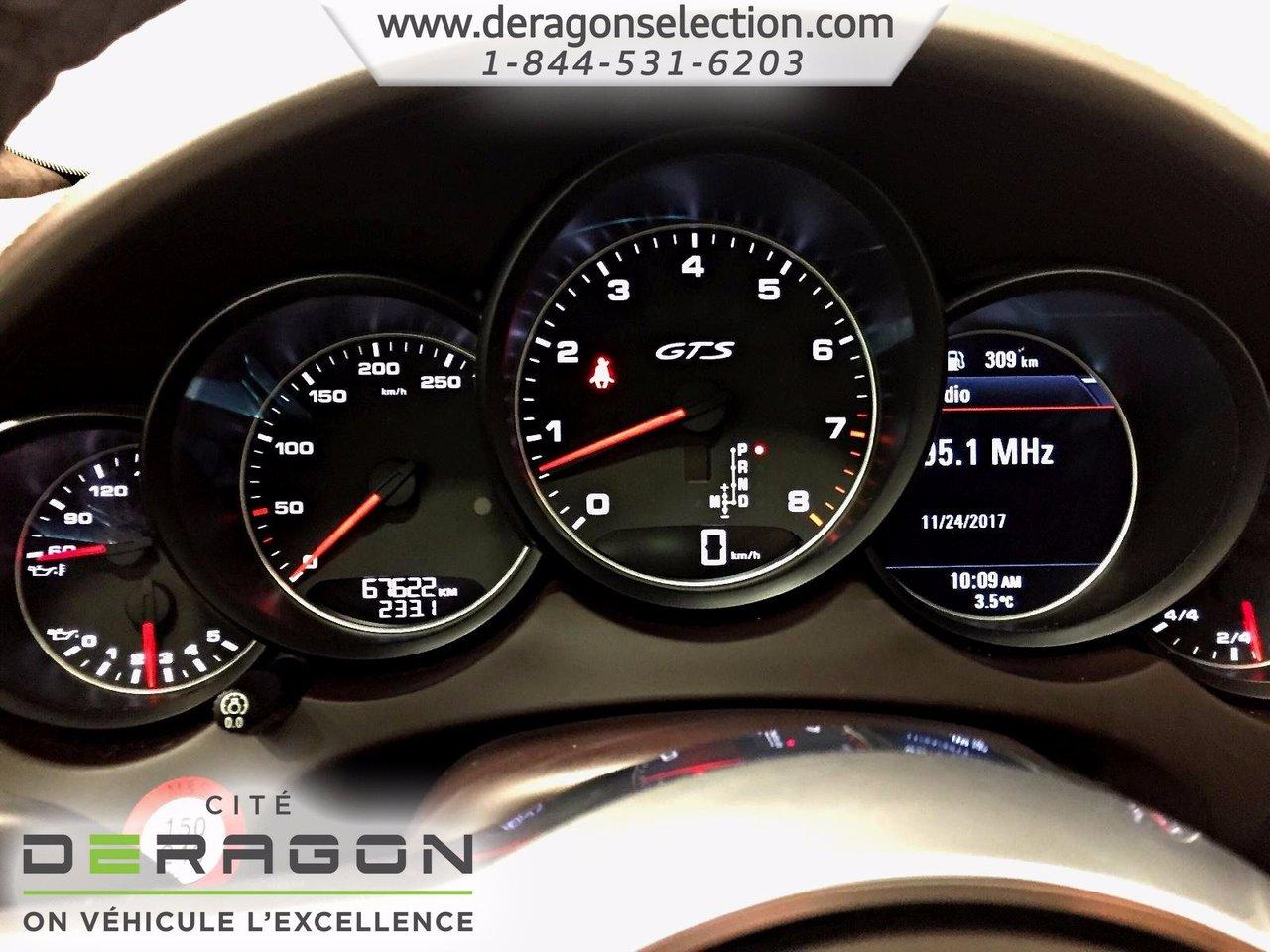 Porsche Cayenne GTS PREMIUM PACK - BOSE - ADAPTIVE CRUISE GTS PREMIUM PACK - BOSE - ADAPTIVE CRUISE 2016Régulateur de vitesse, Toit ouvrant, Essuie-glaces intermittents, Essuie-glace arrière, Anti-démarreur, Freins ABS, Contrôle de stabilité, Coussin gonflable conducteur, Coussins gonflables latéraux, Lecteur CD, Lecteur DVD, Lecteur MP3, Portes électriques, Sièges électriques, Tachymètre, Vitres électriques, Air climatisé, Intérieur en cuir, Climatisation deux zones, Commandes audio au volant, Sièges arrières rabattables, Sièges chauffants, Siège mémoire, Volant ajustable, Tapis protecteurs, Phares haute intensité, Ordinateur de bord, Tout équipé, Caméra de recul, Radio AM/FM, Rétroviseurs, Volant gainé de cuir, Phares automatiques, Rétroviseur électrique, Sièges arrières chauffants, Direction assistée, Télédéverrouillage, Rétroviseurs chauffants, Siège à réglage électrique, Système d\'alarme, Coussins gonflables arrière pour la tête, Essuie-glace détecteur de pluie, Freins à disque, Jantes en alliage, Antipatinage, Phares antibrouillards, Verrous de sécurité pour enfants, Système de surveillance de la pression des pneus, Sièges baquets, Technologie Bluetooth intégrée, Climatiseur automatique, Aide au stationnement (capteurs), Cache bagages, Entreposage Média sur disque dur, Aluminium, Climatisation