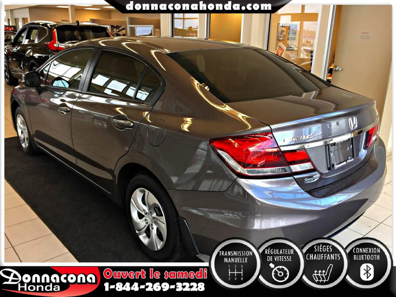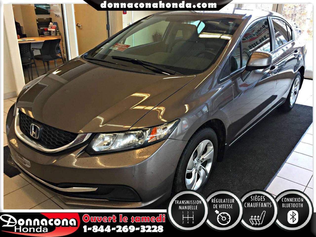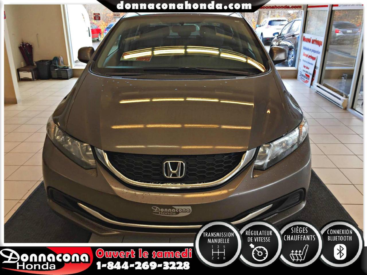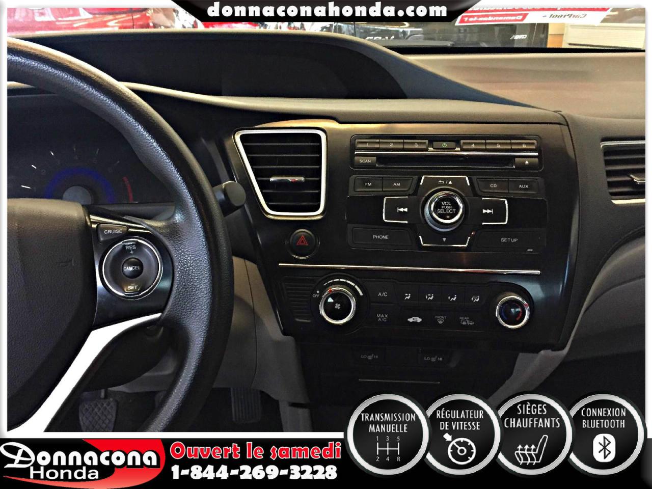 DONNACONA HONDA, HONDA CIVIC LX 2013, TRANSMISSION MANUELLE, RÉGULATEUR DE VITESSE, CONNEXION BLUETHOOT, AIR CLIMATISÉ, SIÈGES CHAUFFANTS, VITRES TEINTÉES, ENJOLIVEURS DE ROUES ET BIEN PLUS ENCORE.