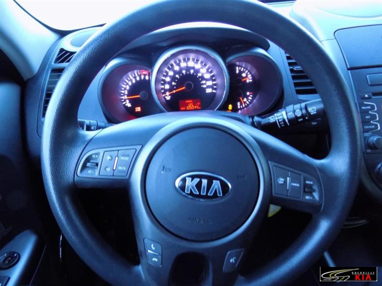 Kia Soul 5dr Wgn 2013\n\nRégulateur de vitesse, Servo-direction, Essuie-glaces intermittents, Freins ABS, Contrôle de stabilité, Serrure à sécurité pour enfants, Lecteur CD, Lecteur MP3, Miroirs chauffants, Miroirs électriques, Portes électriques, Vitres électriques, Air climatisé, Commandes audio au volant, Sièges chauffants, Volant ajustable, Vitres teintées, Radio satellite, Ordinateur de bord, Radio AM/FM, Coussins gonflables arrière pour la tête, Coussins gonflables latéraux pour la tête, Miroir vanité conducteur illuminé, Sièges tissu, Antivol, Antipatinage, Phares antibrouillards, Sièges baquets\n\n