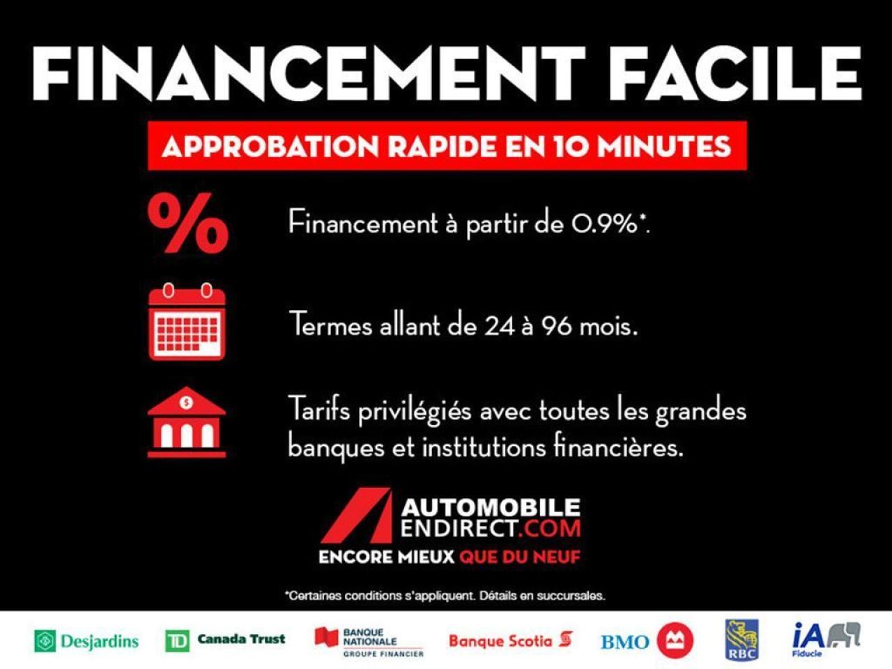 AUTOMATIQUE AUDIO SUR LE VOLANT BLUETOOTH BALANCE DE GARANTIE CLIMATISATION 2 ZONES VERROUILLAGE SANS CLE TOUTE EQUIPEE 1200 véhicules Livraison 24h Financement facile à partir de 0.9% Ouvert 7 jours / 5 soirs Automobile en Direct.com c'est le plus gros inventaire de véhicules d'occasion, avec toutes les marques et tous les modèles offert au meilleur prix. C'est aussi profiter de nombreux avantages exclusifs et d'une gamme complète de services offerts en un seul endroit: Livraison rapide en moins de 24h. Financement facile sur place à partir de 0.9%. 2ième et 3ième chance au crédit 100% approuvée. Allocation incroyable pour vente et échange de véhicule sur place. Au delà des véhicules, Automobile en Direct.com, c'est une équipe de 150 passionnés qui vous accueille dans une ambiance sincère, amicale et courtoise. Il n'y a pas de fla-fla ou de pression inutile. Vous vendez votre véhicule? Nous achetons au meilleur prix même si vous n'achetez pas avec nous. Passez nous voir en magasin ou prenez rendez-vous pour un essai routier. Faites vite. Chaque véhicule est unique. Ce véhicule ne correspond pas exactement à ce que vous recherchez? Visitez Automobile en Direct.com, nous avons accès à toutes les marques et tous les modèles au meilleur prix garanti. Automobile en Direct.com Encore mieux que du neuf. Automobile en Direct.com is the largest used car inventory with all makes and models offered at the lowest price. They also offer access to exclusive offers and services in one location: Fast delivery in less than 24 hours. Easy financing starting at 0.9%. 2nd and 3rd credit chance 100% approved. Best value offered for your trade-in. Beyond the vehicles, Automobile en Direct.com is a team of 150 pasionnate people that welcome you in a simple, friendly and nice atmosphere. There is no run-around or pressure when you deal with us. Are you selling your vehicle? We buy at the best price, even if you don't buy with us. Visit us in store or make an appointment for a test drive. Hurry hup, every vehicle is unique. This vehicle does not match exactly with what you want? Visit us at Automobile en Direct.com, we have access to all makes and vehicle at the lowest price guaranteed Automobile en Direct.com Even better than new.