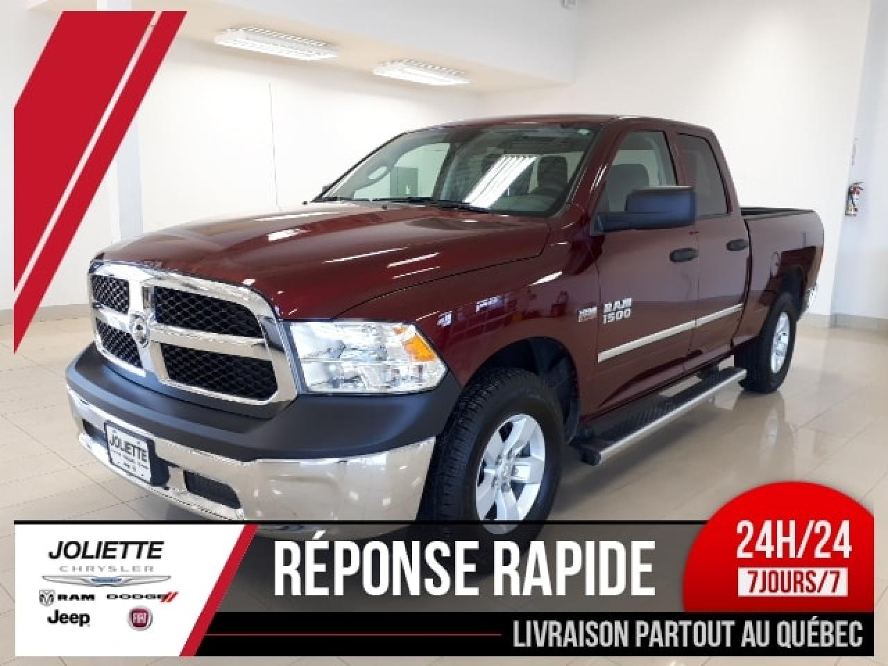 MOULURES LATÉRALES CHROMÉES, DIFFÉRENTIEL 3.92, TÉLÉPHONE MAINS LIBRES BLUETHOOT, ÉCRAN TACTILE 5 POUCES, FOND DE CAISSE, BARRURES DE «TAIL GATE» BARRURES DE ROUES, SHERLOCK. Prise de courant auxiliaire de 12 V Climatisation Bac de rangement derrière le siège (cabine simple) Régulateur de vitesse Accoudoir central pour les sièges avant avec trois porte-gobelets Banquette avant 40-20-40 en vinyle très résistant Banquette arrière relevable en vinyle très résistant (Quad Cab/cabine d'équipe) Système Media Centre : Pôle multimédia avec port USB à distance et prise d'entrée auxiliaire Verrouillage électrique des portes et glaces avant à commande monotouche à l'ouverture et à la fermeture (Quad Cab/cabine d'équipe) Rangement dans le plancher arrière (cabine d'équipe) Bacs de rangement sous la banquette arrière (Quad Cab et cabine d'équipe) Colonne de direction inclinable CARACTÉRISTIQUES EXTÉRIEURES Roues de 17 po en aluminium Pare-chocs avant/arrière chromés Calandre chromée avec garniture hexagonale noire Rétroviseurs extérieurs de 152 x 229 mm (6 x 9 po) noirs à commande électrique, chauffants et repliables manuellement (cabine Quad/d'équipe) Éclairage de l'espace utilitaire Bouclier supérieur moulé noir Phares halogènes à quatre lentilles SÉCURITÉ Six sacs gonflables comprenant les sacs gonflables multimodes du conducteur et du passager avant, les rideaux gonflables latéraux et les sacs gonflables latéraux montés dans les sièges avant Phares automatiques Système électronique d'anti dérapage (ESC)7 avec assistance au départ en pente, dispositif anti louvoiement de la remorque, dispositif électronique antiroulis, assèchement automatique des freins, freinage d'urgence anticipé et anti patinage Freins antiblocage à disque aux quatre roues avec assistance au freinage Pneu de secours pleine grandeur Hayon verrouillable Dispositif antivol Sentry KeyMD Surveillance de la pression des pneus avec affichage Faisceau électrique de remorque à 4 et à 7 broches Batterie sans entretien de 730 A Boîte de transfert à prise temporaire à commande électronique et passage à la volée (4x4) Chauffe-bloc Barre antiroulis avant Suspension avant avec bras supérieurs et inférieurs, ressorts hélicoïdaux et amortisseurs renforcés COMPÉTENCES ET FONCTIONNALITÉS suite Suspension arrière à ressorts hélicoïdaux multibras avec amortisseurs renforcés Direction à crémaillère électrique Recouvrement du plancher en moquette Banquette avant 40-20-40 en tissu Tapis protecteurs Radio satellite SiriusXM avec abonnement d'un an GARANTIE 5 ANS/ 100 000KM. INFO TEXTO: 450-760-8834 Le monde vient de partout pour profiter de nos prix! Grâce à un important réseau bâti en plus de 30 années de service, nous allouons également des montants exceptionnels sur TOUTES les échanges, de toutes les marques! Nous reprenons même en échange les bateaux, motos, motoneiges, etc. Tout cela accompagné de notre service exceptionnel comme le démontre nos centaines d'avis Google/Facebook/Reviewsii. Joliette Dodge Nous sommes une concession familiale qui marche au VOLUME! C'est pourquoi nous offrons d'excellents prix! C'est aussi grâce à un service exceptionnel que nous comptons plus de 30 ans d'affaires avec le même président. Notre entreprise familiale sait être à l'écoute de ses clients et veut s'assurer de garder ses clients satisfait à long terme. Nous sommes l'une des rares concessions recommandé CAA Québec, ce qui signifie un taux de satisfaction de la clientèle de plus de 95% pour le service après-vente! Encore une fois, c'est pourquoi plus de 250 avis ont été laissé avec une moyenne de 4.5 étoiles sur 5 à travers Google, Facebook et Reviewsii. Nous sommes à seulement 25 minutes de l'est de Montréal et de Terrebonne au coin de la route 158 et autoroute 31. Nous offrons un service de livraison rapide à la grandeur de la province par remorque fermée. De plus, la pré-approbation de crédit est disponible. Faite une demande internet ou appelez nous et voyez pourquoi chez Joliette Dodge, Ça vaut le détour! INFO TEXTO: 450-760-8834 PS. Plusieurs promotions Chrysler Dodge Jeep et Ram pour: employés de Bell Canada, Firestone, Cascades et plusieurs autres compagnies Appelez-nous pour savoir si vous êtes éligibles à un programme spéciale! -- We also speak English! We are at 25 min of Montreal. We're a family owned business for more than 30 years. We have one of the highest ratings of customer satisfaction in Quebec. See it by yourself: Text us 7 days a week at 450-760-8834. Rapid response guaranteed! Joliette Dodge, It's worth the detour!