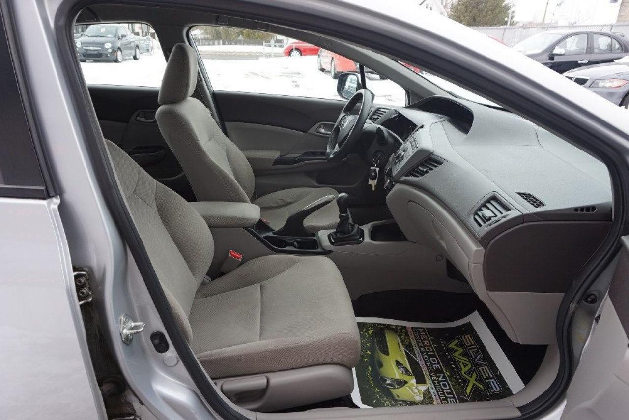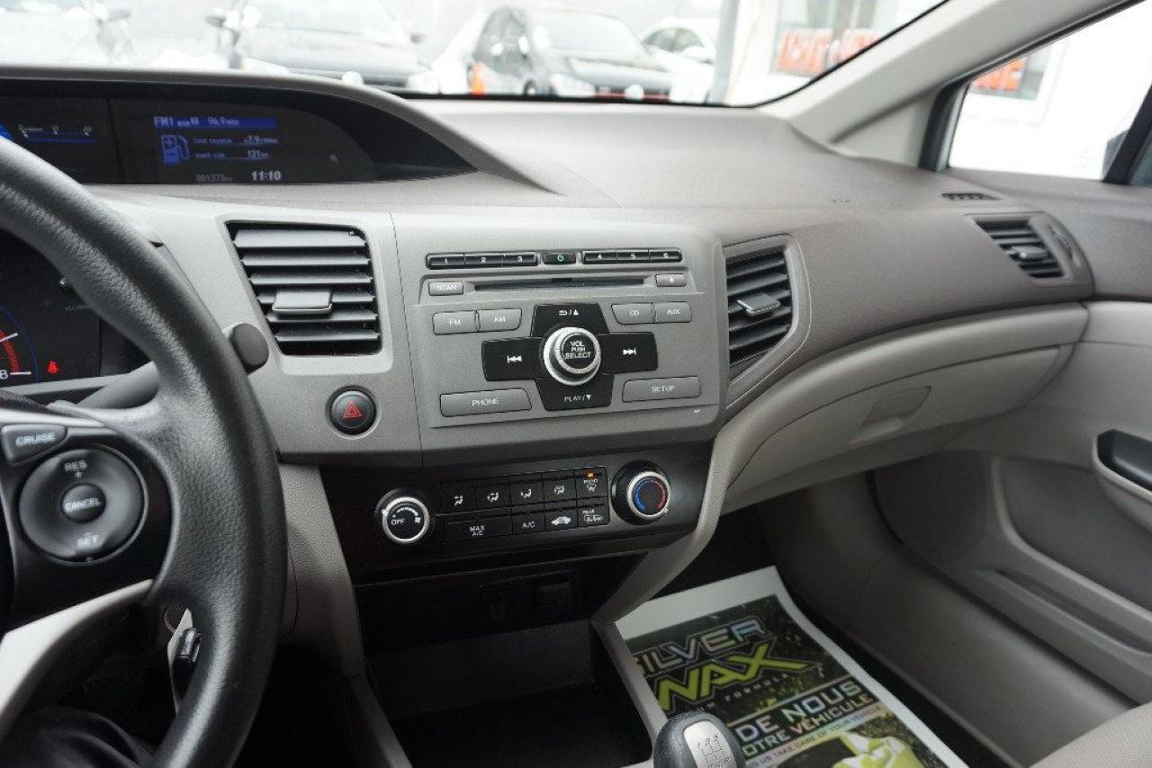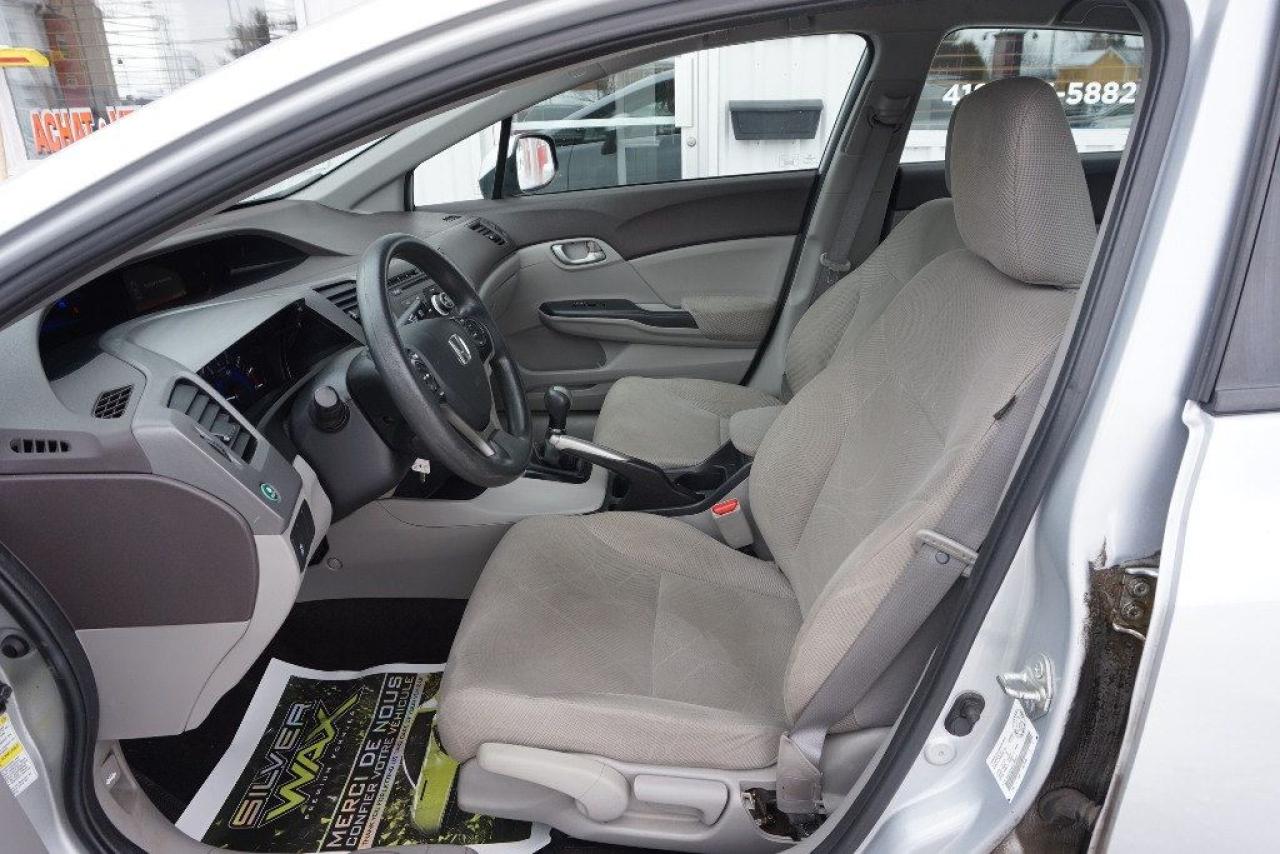 HONDA CIVIC LX 2012 Berline Édition LX 4cyl 1.8 Litres ** FULL ÉQUIPÉ A/C MAGS RTX -- TRANSMISSION MANUELLE 5 VITESSES -- AVEC SEULEMENT 81 373 KM CERTIFIÉ / 4 CYLINDRES 1.8 Litres Mode Econo TRÈS ÉCONOMIQUE, DURABLE ET FIABILITÉ HONDA RECONNUE (RAPPORT CARPROOF INCLUS) COULEUR EXTÉRIEUR ARGENT SILVER, INTÉRIEUR GRIS FONCÉ / NOIR. INSPECTION COMPLÈTE INCLUSE -- ÉCHANGE ACCEPTÉE -- FINANCEMENT SUR PLACE À PARTIR 4.99 % -- GARANTIE INCLUS : 1 MOIS OU 1700 KM GROUPE MOTOPROPULSEUR. ÉQUIPEMENT COMPLET LX : AIR CLIMATISÉ - RÉGULATEUR DE VITESSES - JANTES 15 POUCES RTX / PNEUS D'ÉTÉ SEULEMENT - GROUPES ÉLECTRIQUES COMPLETS - ORDINATEUR DE BORD - LECTEUR CD Mp3 - CONTRÔLE AUDIO AU VOLANT - BLUETOOTH/TÉLÉPHONE - PRISE AUXILIAIRE - VOLANT AJUSTABLE === POUR PLUS D'INFORMATION DEMANDER (DAVID.LAMONTAGNE) 418-903-5882 // 418-931-4036 Cell === FINANCEMENT FACILE SUR PLACE À PARTIR DE 4.99 % NOUS SOMMES OUVERTS 6 JOURS : 2430 BOUL GUILLAUME-COUTURE, LÉVIS G6W-2R5 : AU PLAISIR DE VOUS SERVIR WWW.AUTOSOCCASIONS.CA