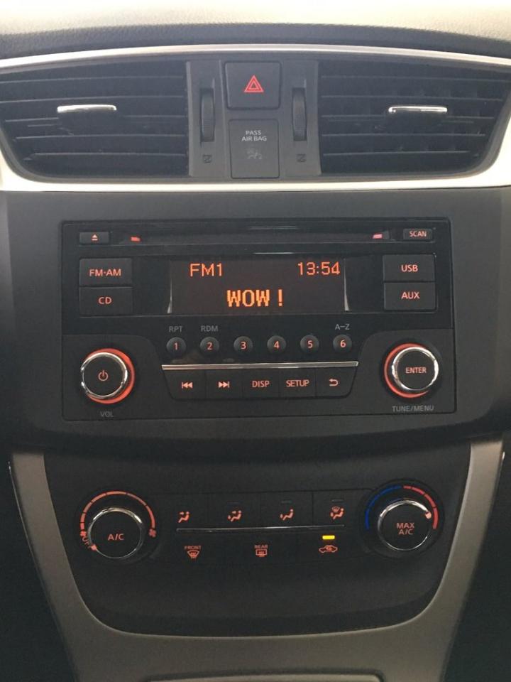 Nissan Sentra S 2015Régulateur de vitesse, Essuie-glaces intermittents, Anti-démarreur, Freins ABS, Contrôle de stabilité, Coussins gonflables latéraux, Lecteur CD, Lecteur MP3, Portes électriques, Vitres électriques, Air climatisé, Volant ajustable, Tapis protecteurs, Ordinateur de bord, Radio AM/FM, Rétroviseur électrique, Direction assistée, Télédéverrouillage, Rétroviseurs chauffants, Coussins gonflables arrière pour la tête, Démarrage sans clé, Rétroviseurs électriques, Antipatinage, Verrous de sécurité pour enfants, Système de surveillance de la pression des pneus, Sièges baquets, Prise Auxiliaire, Technologie Bluetooth intégrée, Port USB