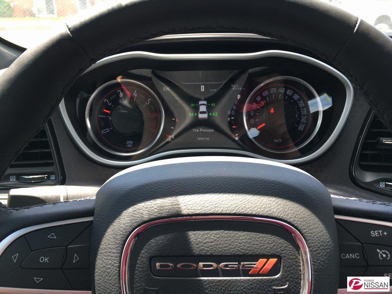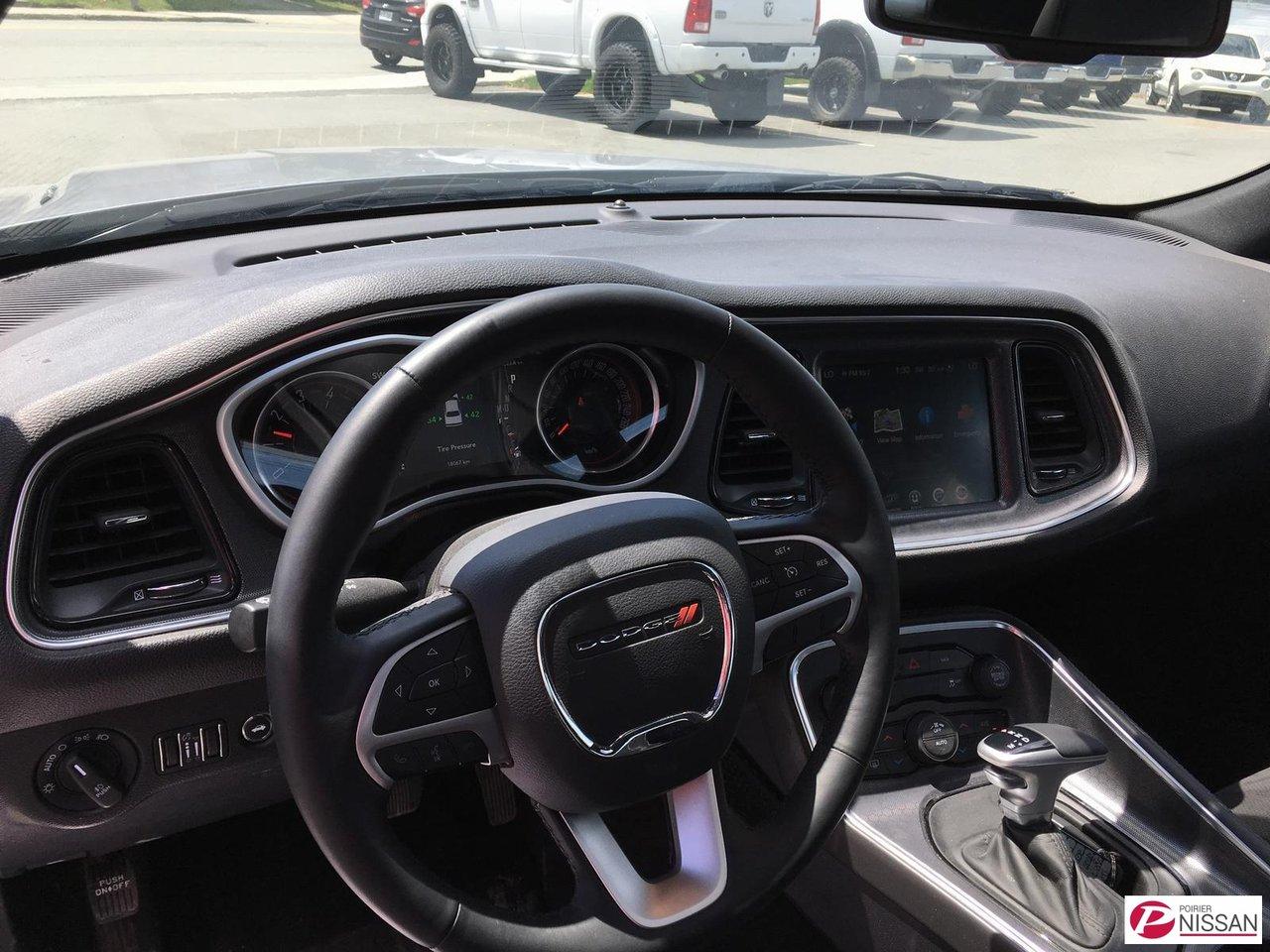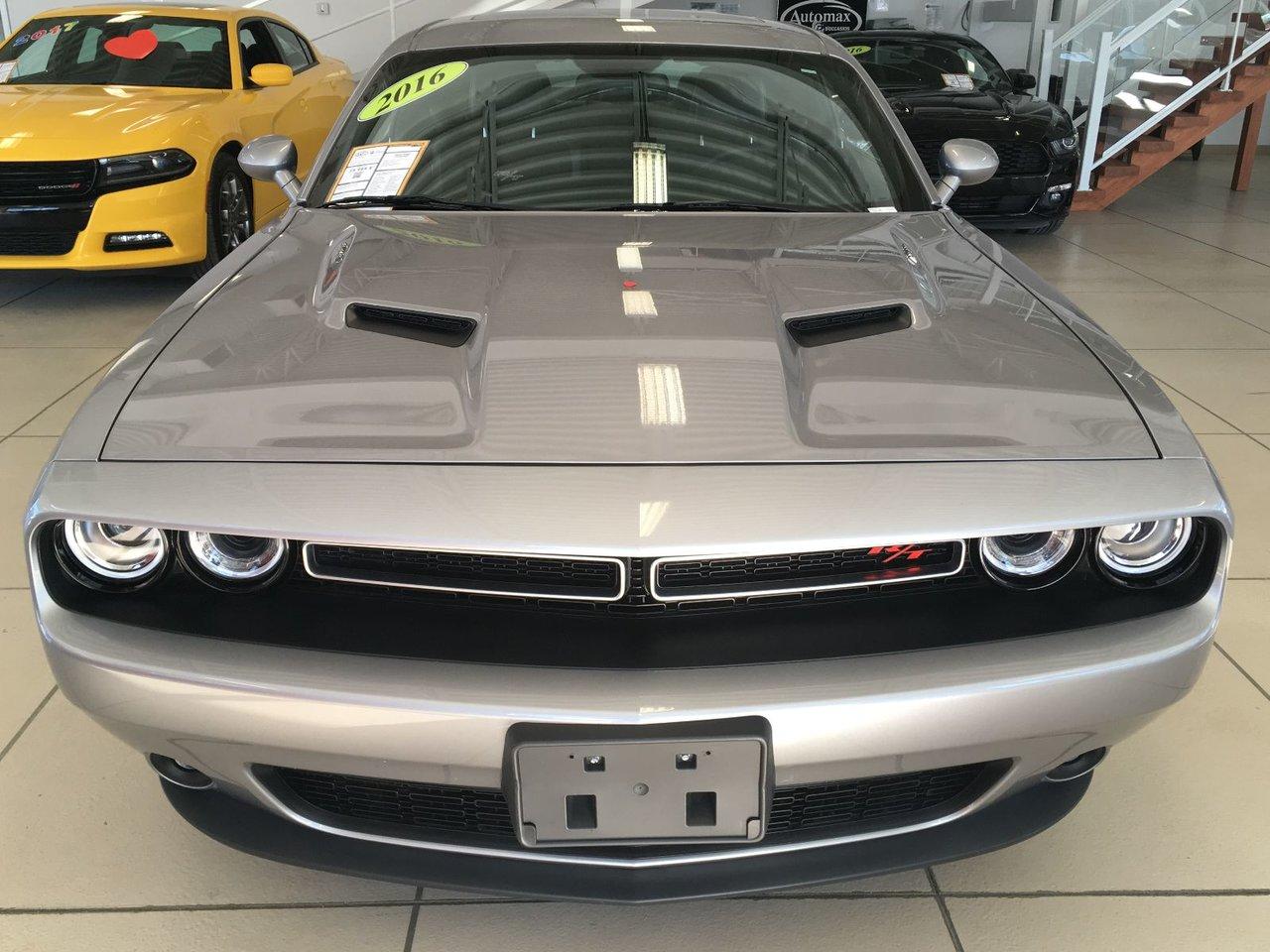 Dodge Challenger R/T 2016Régulateur de vitesse, Essuie-glaces intermittents, Anti-démarreur, Freins ABS, Contrôle de stabilité, Coussin gonflable conducteur, Démarreur à distance, Lecteur MP3, Miroirs chauffants, Portes électriques, Sièges électriques, Vitres électriques, Air climatisé, Intérieur en cuir, Climatisation deux zones, Commandes audio au volant, Sièges arrières rabattables, Sièges chauffants, Volant ajustable, Aileron, Tapis protecteurs, Radio satellite, Ordinateur de bord, Caméra de recul, Radio AM/FM, Rétroviseurs, Direction assistée, Télédéverrouillage, Rétroviseurs chauffants, Banquette arrière divisé, Siège à réglage électrique, Système d\'alarme, Démarrage sans clé, Rétroviseurs électriques, Jantes en alliage, Antipatinage, Phares antibrouillards, Coussins gonflables, Ouverture du volet à essence de l\'intérieur, Système de surveillance de la pression des pneus, Dégivreur de lunette arrière, Sièges baquets, Prise Auxiliaire, Technologie Bluetooth intégrée, Port USB, Climatiseur automatique, Aide au stationnement (capteurs)