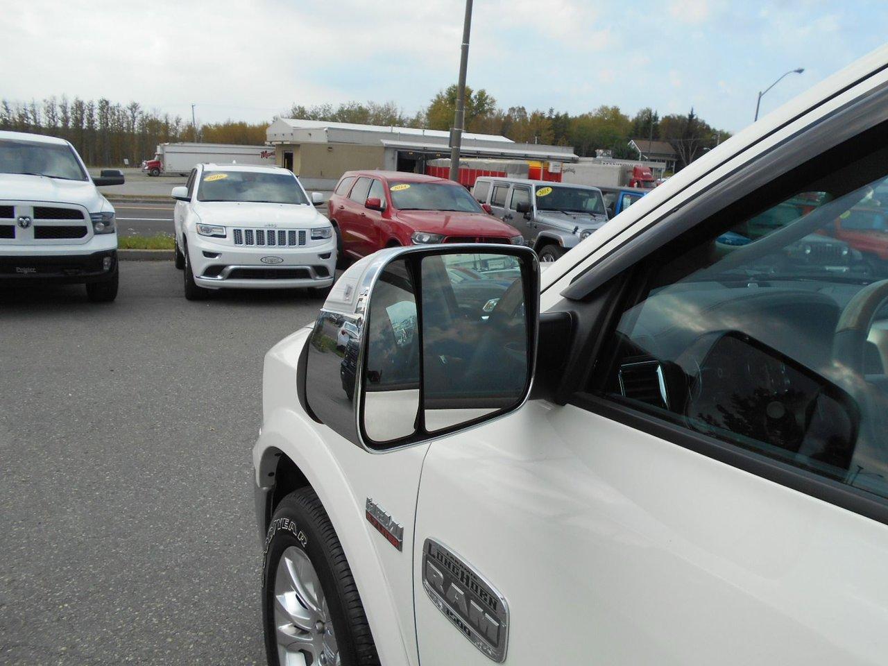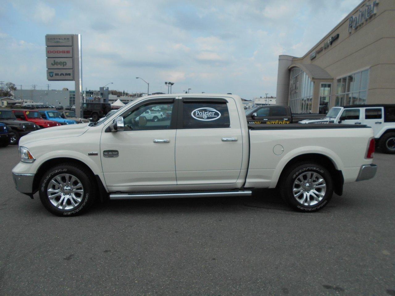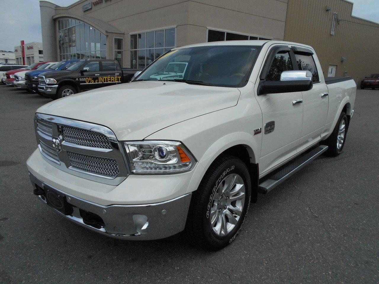 RAM 1500 Crewcab longhorn INCLUS 4 PNEUS HIVERS 2017Régulateur de vitesse, Toit ouvrant, Essuie-glaces intermittents, Anti-démarreur, Freins ABS, Contrôle de stabilité, Coussin gonflable conducteur, Démarreur à distance, Chauffe-moteur, Miroirs chauffants, Portes électriques, Sièges électriques, Tachymètre, Téléphone cellulaire, Vitres électriques, Air climatisé, Intérieur en cuir, Console au plafond, Climatisation deux zones, Commandes audio au volant, Sièges arrières rabattables, Sièges chauffants, Volant ajustable, Marchepieds, Tapis protecteurs, Vitres teintées, Doublure de caisse, Attelage remorque, Phares haute intensité, Radio satellite, Ordinateur de bord, Tout équipé, Caméra de recul, Horloge, Radio AM/FM, Rétroviseurs, Sièges arrières chauffants, Direction assistée, Télédéverrouillage, Rétroviseurs chauffants, Banquette arrière divisé, Siège à réglage électrique, Système d\'alarme, Essuie-glace détecteur de pluie, Verrouillage sans clé, Rétroviseurs électriques, Jantes en alliage, Antipatinage, Phares antibrouillards, Coussins gonflables, Verrous de sécurité pour enfants, Système de surveillance de la pression des pneus, Miroirs ajustables de l\'intérieur, Sièges baquets, Sièges avec fonction mémoire, Prise Auxiliaire, Points d\'ancrage pour sièges d\'enfant, Technologie Bluetooth intégrée, Port USB, Climatiseur automatique, Système HomeLink, Aide au stationnement (capteurs)