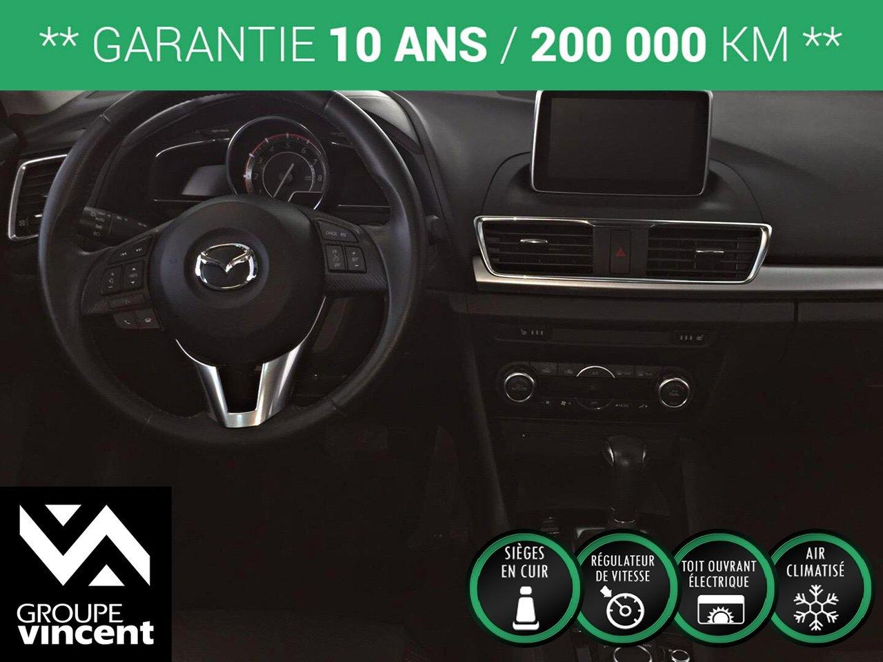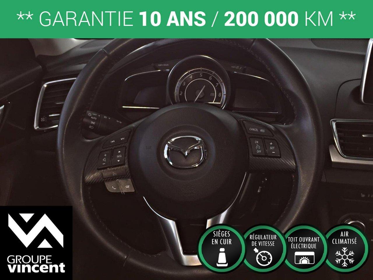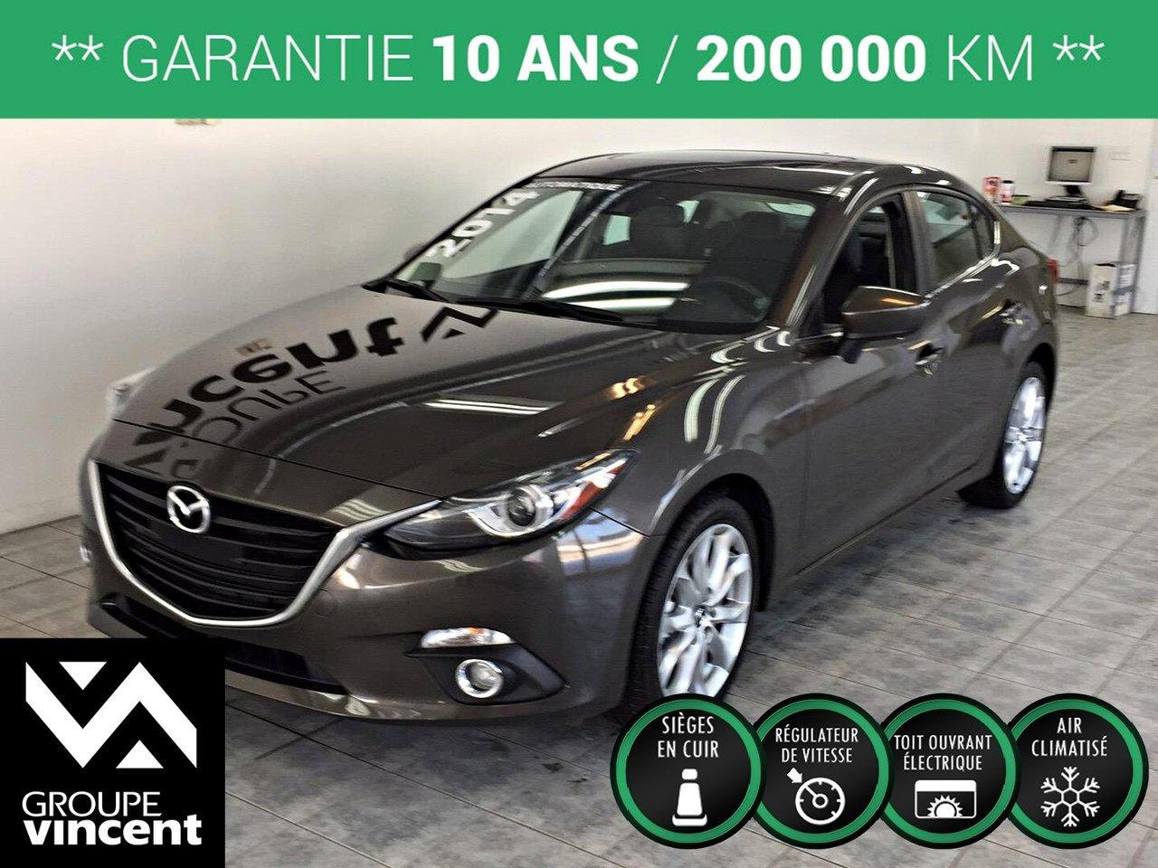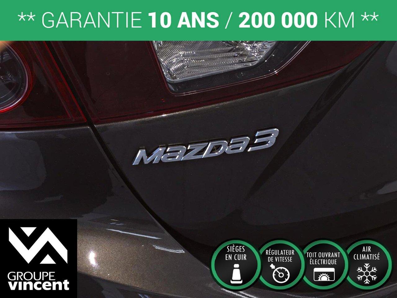 Mazda 3 GT-SKY**CUIR** D?marreur ? distance! 2014Régulateur de vitesse, Toit ouvrant, Essuie-glaces intermittents, Anti-démarreur, Freins ABS, Contrôle de stabilité, Coussin gonflable conducteur, Coussins gonflables latéraux, Démarreur à distance, Lecteur CD, Lecteur MP3, 6 Haut-parleurs, Portes électriques, Vitres électriques, Air climatisé, Intérieur en cuir, Climatisation deux zones, Commandes audio au volant, Sièges chauffants, Volant ajustable, Moonroof, Tapis protecteurs, Ordinateur de bord, Tout équipé, Caméra de recul, Volant gainé de cuir, Phares automatiques, Rétroviseur électrique, Direction assistée, Télédéverrouillage, Rétroviseurs chauffants, Siège à réglage électrique, Système d\'alarme, Coussins gonflables arrière pour la tête, Sièges tissu, Essuie-glace détecteur de pluie, Démarrage sans clé, Freins à disque, Sièges chauffants - Avant, Rétroviseurs électriques, Jantes en alliage, Antipatinage, Phares antibrouillards, Verrous de sécurité pour enfants, Sièges baquets, Prise Auxiliaire, Technologie Bluetooth intégrée, Climatiseur automatique, Aluminium, Climatisation