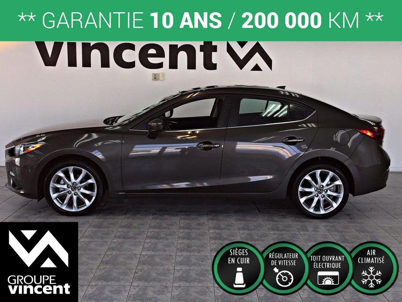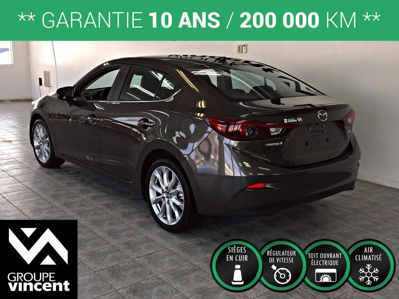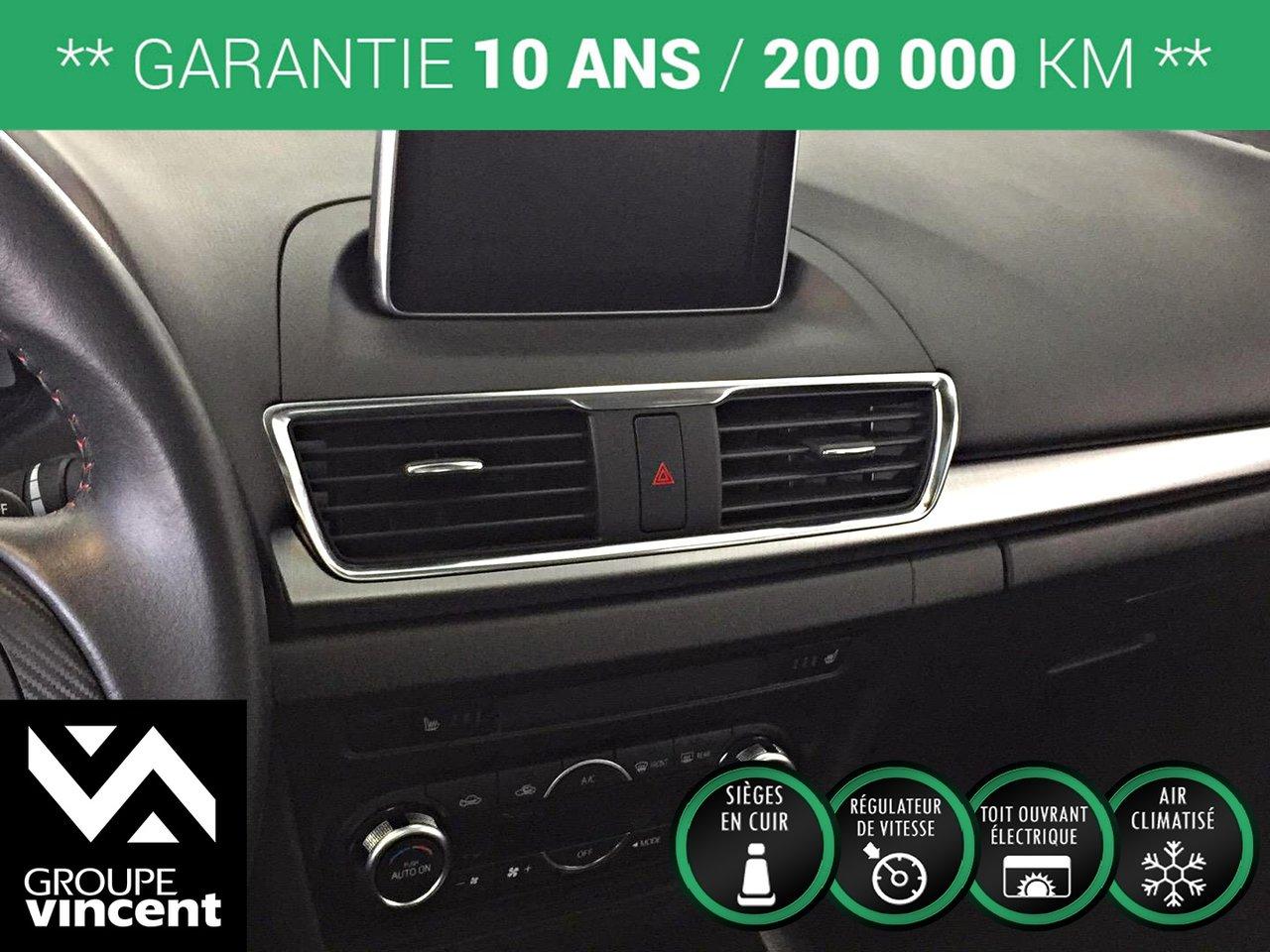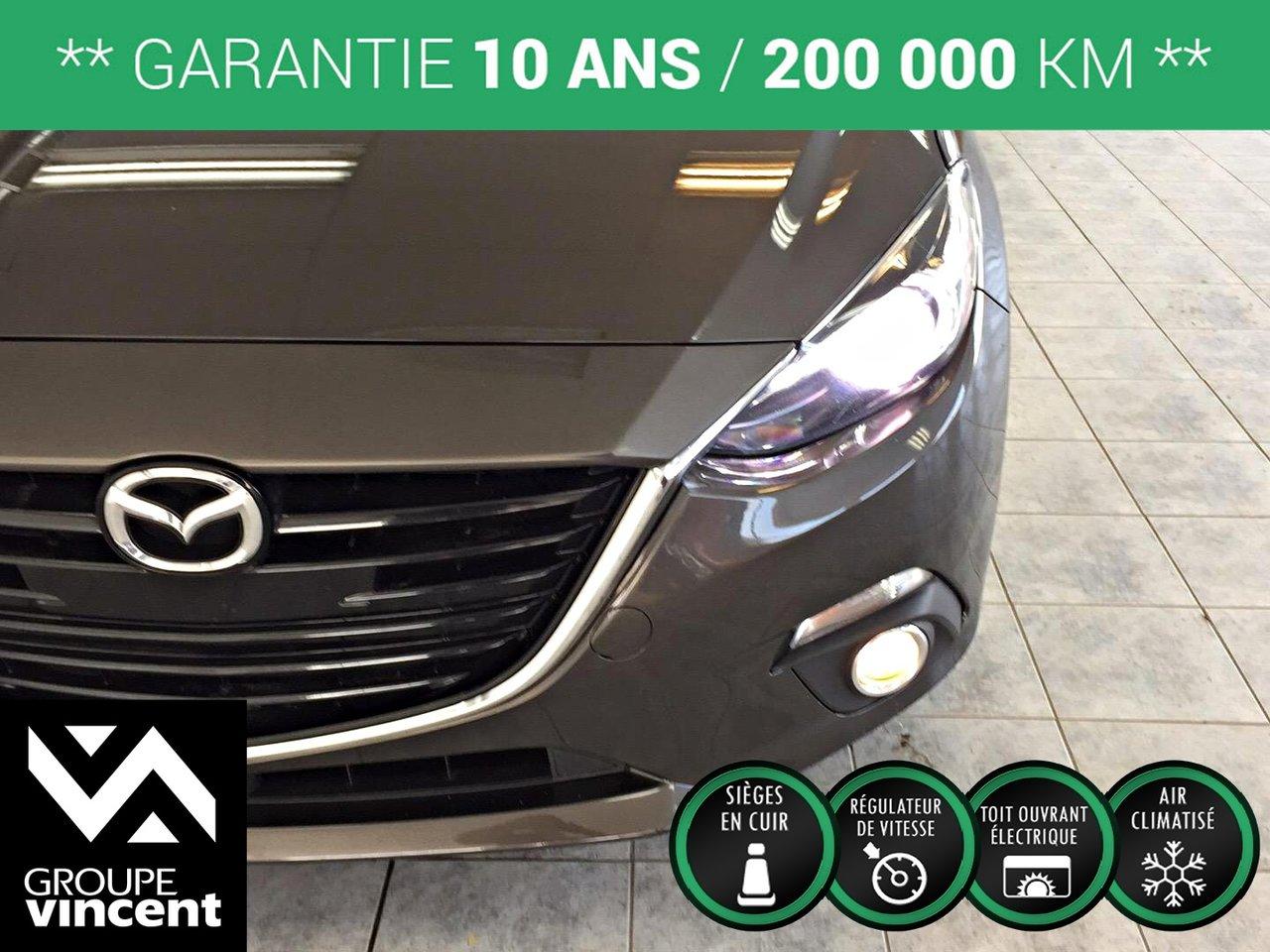 Mazda 3 GT-SKY**CUIR** D?marreur ? distance! 2014Régulateur de vitesse, Toit ouvrant, Essuie-glaces intermittents, Anti-démarreur, Freins ABS, Contrôle de stabilité, Coussin gonflable conducteur, Coussins gonflables latéraux, Démarreur à distance, Lecteur CD, Lecteur MP3, 6 Haut-parleurs, Portes électriques, Vitres électriques, Air climatisé, Intérieur en cuir, Climatisation deux zones, Commandes audio au volant, Sièges chauffants, Volant ajustable, Moonroof, Tapis protecteurs, Ordinateur de bord, Tout équipé, Caméra de recul, Volant gainé de cuir, Phares automatiques, Rétroviseur électrique, Direction assistée, Télédéverrouillage, Rétroviseurs chauffants, Siège à réglage électrique, Système d\'alarme, Coussins gonflables arrière pour la tête, Sièges tissu, Essuie-glace détecteur de pluie, Démarrage sans clé, Freins à disque, Sièges chauffants - Avant, Rétroviseurs électriques, Jantes en alliage, Antipatinage, Phares antibrouillards, Verrous de sécurité pour enfants, Sièges baquets, Prise Auxiliaire, Technologie Bluetooth intégrée, Climatiseur automatique, Aluminium, Climatisation