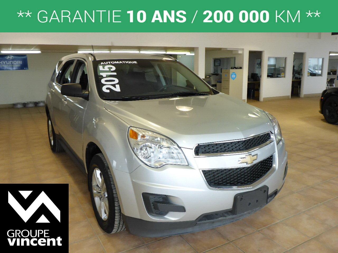 Chevrolet Equinox LS**GARANTIE 10 ANS** Confortable et pratique ! 2015Régulateur de vitesse, Essuie-glaces intermittents, Essuie-glace arrière, Anti-démarreur, Freins ABS, Contrôle de stabilité, Coussin gonflable conducteur, Coussins gonflables latéraux, Lecteur CD, Lecteur MP3, 6 Haut-parleurs, Tachymètre, Vitres électriques, Air climatisé, Commandes audio au volant, Sièges arrières rabattables, Volant ajustable, Tapis protecteurs, Ordinateur de bord, Radio AM/FM, Phares automatiques, Rétroviseur électrique, Direction assistée, Télédéverrouillage, Banquette arrière divisé, Siège à réglage électrique, Coussins gonflables arrière pour la tête, Sièges tissu, Siège conducteur - soutien lombaire, Freins à disque, Rétroviseurs électriques, Jantes en alliage, Antipatinage, Verrous de sécurité pour enfants, Système de surveillance de la pression des pneus, Sièges baquets, Prise Auxiliaire, Technologie Bluetooth intégrée, Port USB, Aluminium, Climatisation