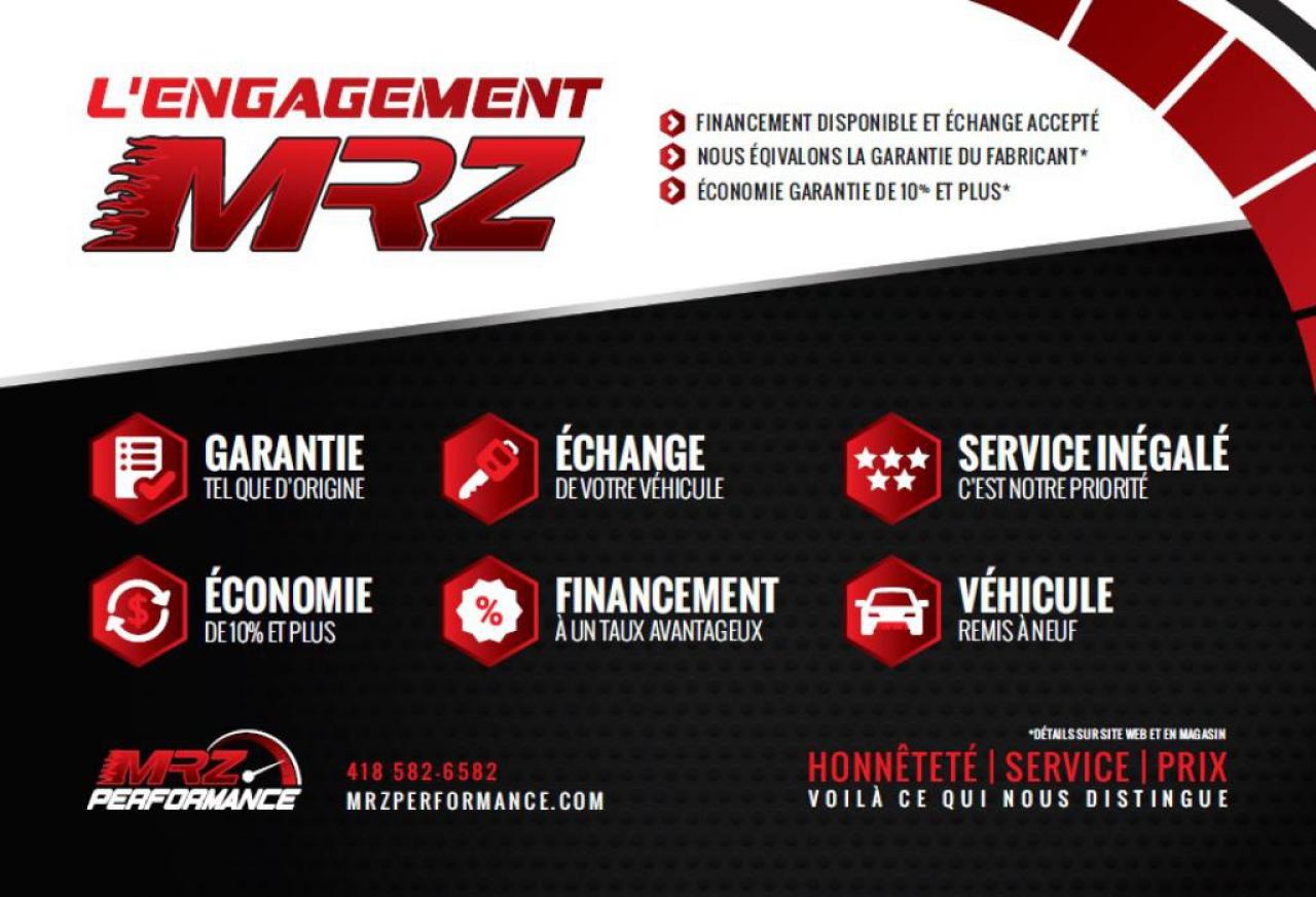 ** GARANTIE 3ans/60 000km sur l'ensemble du véhicule et 5ans/100 000km moto-propulseur à partir de la dms si remis à neuf chez MRZ ou 5ans/100 000km moto-propulseur seulement à partir de la dms si acheté endommagé ** ÉCONOMIE GARANTIE DE 10% et même plus dans la majorité des cas! ** Service inégalé - Financement avantageux - Échanges acceptés - On équivaut la garantie d'origine! ** C'est L'ENGAGEMENT MRZ - découvrez en tous les avantages au www.MRZPERFORMANCE.com et en magasin **