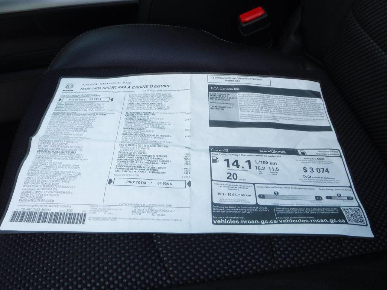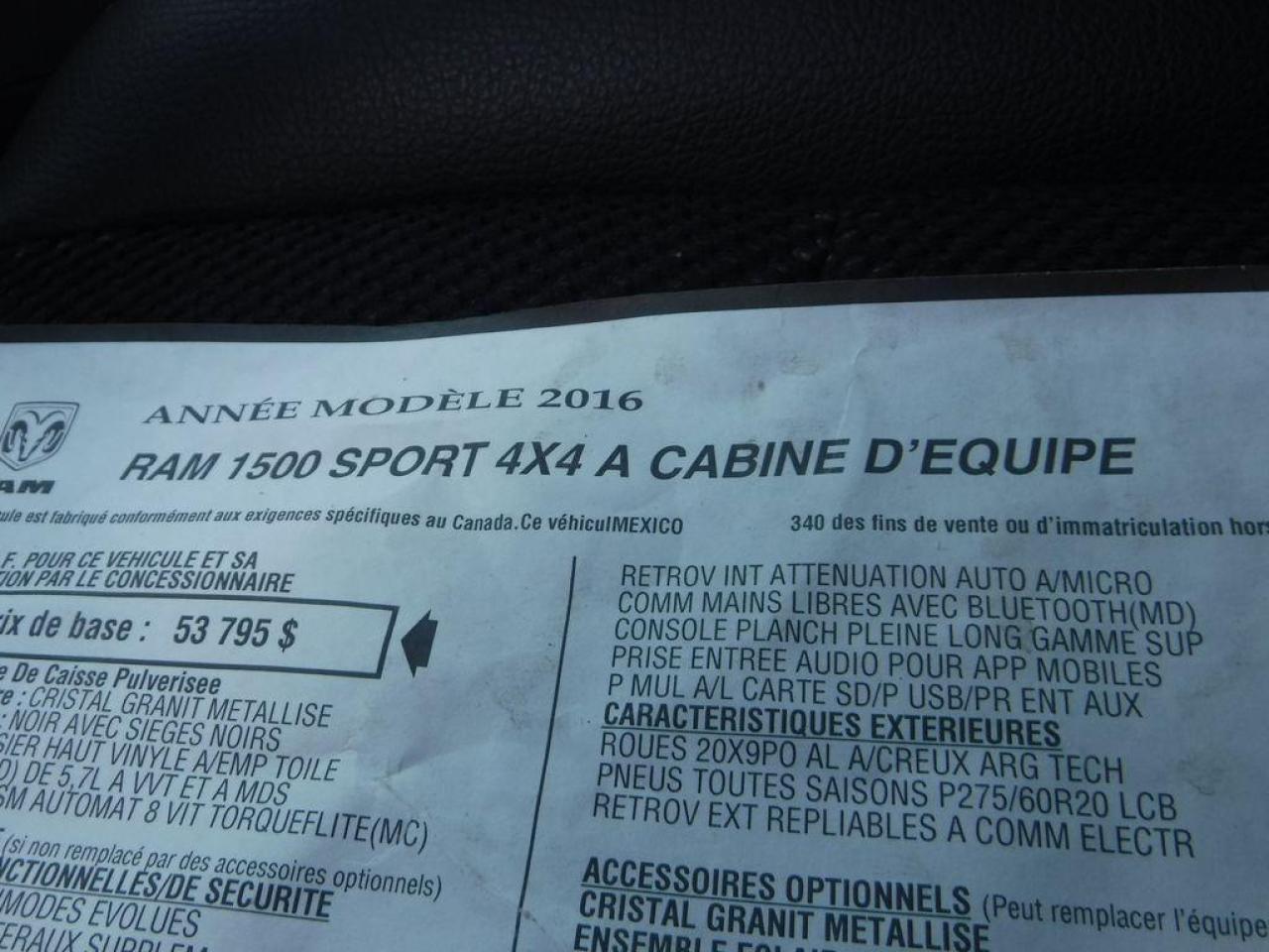 Dodge Ram 1500 SPORT R/T 4X4 2016 Gris foncé avec intérieur en cuir/tissu noir, Crew cab avec boite de 6.5pi - Un truck avec un look d'enfer à voir absolument! - Faites l'envie de tous avec un des plus beau et le plus équipé des camion RAM sur le marché! On vous met au défi de trouver un camion avec moins de kilométrage sur le marché que le nôtre!! Il est carrément à l'état neuf!! - * Visitez le WWW.MRZPERFORMANCE.COM pour tous les détails et beaucoup plus de photos!! * - Faites vite, les RAM Sport en très grande demande et ça part vite - Moteur V8 5.7l HEMI de 390HP avec transmission automatique 8 rapports avec bouton électronique. Très puissant! ÉTAT NEUF!! Très bas kilométrage, Seulement 7638 km! 4X4 Crew Cab avec boite de 6.5pi. Camion FULL ÉQUIP!! Mags 20'' avec pneus d'hiver Wintercat en bonne condition!! - Miroirs électriques et chauffants - Miroirs de remorquage - Towing Package - Commandes au volant - Bluetooth - Sirius - Prise USB - Prise 12V et 115V - Backglass sliding électrique - Intérieur en cuir/tissu noir - A/C - Cruise control - Tout électrique - Fogs - Console centrale - Système navigation GPS avec grosse écran tactile - Vitres teintées - Chauffe moteur - Vitres électriques - Sièges électriques et chauffants - Wiper intermittent - Différentiel autobloquant - Télécommande porte garage - Lumières avant projector halogène - 2X Clés intelligentes avec Démarreur OEM - Lumières arrière LED - Fond boite plastique OEM - Push to start (démarrage) - Sélecteur 4X4 électrique - Toit ouvrant - Caméra de recul - Boite de frein électrique - Suspension à l'air d'origine - Volant chauffant - Hood R/T - Déflecteur capot - etc!! Tout un truck!-- Accidenté sur le toit ainsi qu'au niveau de la boite du camion. Ce superbe RAM SPORT est présenté tel que nous l'avons acheté, pas étiré et pas camouflé comme chez la compétition. Aucun camouflage de dommages sur nos véhicules!Pour la réparation, Besoin du Toit complet, Miroir gauche, Lumière avant gauche (lentille grafigné), Couvert bumper avant (ou a réparé), Backglass, Coté boite droit (ou une boite complète), 2X Tail light, Tailgate, Bumper arrière assemblé et la Tailpipe droit. A réparé: Voute ( ou a changé), Marchepied cabine gauche, Porte avant gauche (léger), 2X Portes arrières (ou a changées) et les 2X Coin cab arrière. Les Mags sont égratignés. Les 2X Ceintures avant sont déployées. Les 2X Ceintures arrière sont dans l'estimée mais ne sont pas déployées (très abordable chez le dealer). Tous les Ballons et les autres Ceintures sont intacts. Aucun impact subit dans le devant. Pas de gros frame à faire sur ce camion (toujours mieux de vérifier tout de même). Le Ballon de suspension arrière droit a été changé lors de l'arrivée du camion sur place. Nous pouvons vous fournir les pièces nécessaires à la réparation de ce véhicule à prix très compétitif. Disponible tel quel ou réparé par des professionnels et inspecté par la SAAQ - Toute la mécanique est intact et en parfait état de marche! Valeur neuf de plus de 64 600$ sur la feuille de vitre Dodge. Un autre super beau Ram dans notre bel inventaire de camion légèrement accidenté!! À voir sans faute! Impossible de trouver meilleur qualité prix chez la concurrence! Pick-up très recherché!! Carrément flambant neuf avec Seul. 7638 km au compteur!! Faites vite!! * VGA QUÉBEC / SALVAGE TITLE* - PLUSIEURS AUTRES PICK-UP EN STOCK!! Venez nous voir ou allez visiter notre site internet pour plus d'informations! - N'hésitez pas à nous rejoindre avec vos questions! Automobiles MRZ, la référence dans l'accidenté léger au Québec! WE SPEAK ENGLISH PLEASE CONTACT US - MRZ IS THE VEHICLE CAR EXPORT AND IMPORT SPECIALIST - USA - AFRICA - MIDDLE EAST - EUROPE - MRZ EST LE SPÉCIALISTE EN EXPORTATION et IMPORTATION DE VÉHICULES - USA - AFRIQUE - EUROPE - PROCHE ORIENT Visitez-nous aussi sur Facebook! Merci!