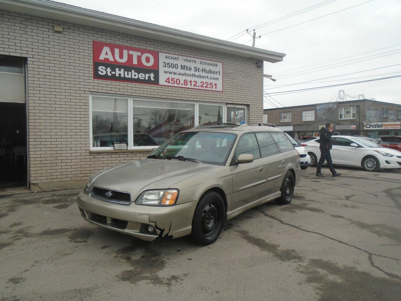 SUBARU LEGACY 2003, TRANSMISSION AUTOMATIQUE, 211 000 KM CERTIFIÉ, MOTEUR 4 CYLINDRES 2.5 LITRES FIABLE ET ROBUSTE. VÉHICULE TOUT ÉQUIPÉ AVEC VITRES PORTES ET MIROIRS ÉLECTRIQUE, AIR CLIMATISÉ, RÉGULATEUR DE VITESSE, TOIT OUVRANT, SIÈGES EN CUIR, ÉLECTRIQUE ET CHAUFFANTS, RADIO AM/FM/CD, VOLANT MULTIFONCTIONS ET AJUSTABLE, BIEN CHAUSSÉ SUR 4 BON PNEUS SUR JANTES, VITRES TEINTÉS ET BIEN PLUS! UNE OFFRE A NE PAS MANQUER !!! PROFITEZ DE NOTRE FINANCEMENT CLÉ EN MAIN AVEC UN TAUX À PARTIR DE 4.9%. FINANCEMENT MAISON DISPONIBLE APPROUVÉ A 100%, AUCUN CAS REFUSÉ! NOUS OFFRONS LES MEILLEURS PRODUITS DE FINANCEMENT, AVONS UN APPROVISIONNEMENT EXCLUSIF AUPRÈS DES CONCESSIONNAIRES ET OFFRONS LES MEILLEURS PRIX DU MARCHÉ ! OUVERT 7 JOURS SEMAINE. POSSIBILITÉ d ÉCHANGE ET PLUS ENCORE ! FINANCEMENT 1RE 2E ET 3E CHANCE AU CRÉDIT WWW.AUTOSTHUBERT.COM POUR VOIR TOUS LES VÉHICULES EN INVENTAIRE. 2 CONCESSIONNAIRES SUR LA RIVE-SUD DE MONTREAL. 308837 PL