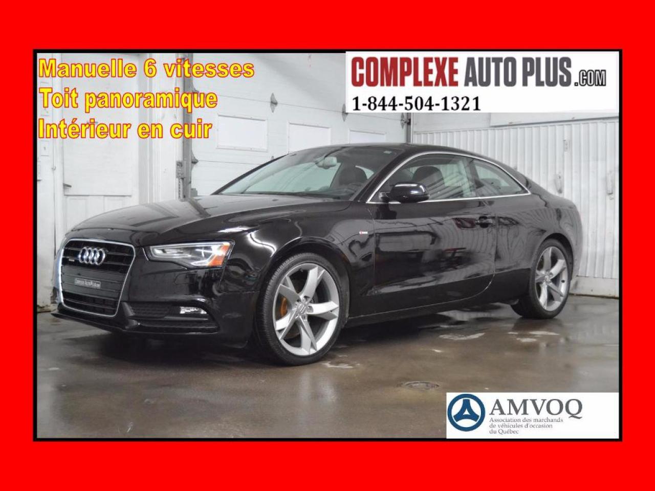 WOW Superbe A5 SLINE Manuelle 6 vitesses Quattro! Véhicule rare sur le marché! Couleur Noir avec intérieur en Cuir noir! Très propre! Véhicule inspecté et Garanti! Plan sécuritaire inclus dans le prix! Promotion spéciale: Financement 101$/sem. Tout inclus. 0$ comptant! Assistance routière et GARANTIE jusqu'au 15 octobre 2018 ou 120 000 KM inclus dans les versements! Terme 72 mois à 4,99%. Équipements principaux: Miroirs chauffant, Ouverture du coffre à distance, Toit panoramique, Mags, Bluetooth, Radio Satellite SIRIUS, Phares antibrouillards, Phares automatiques, Sièges électriques et chauffants, Commandes au volant, Contrôle de stabilité et d'anti patinage, Régulateur de vitesse, Groupe électrique, Air climatisé automatique, Toute équipé, Impeccable! Rapport historique CarProof gratuit en main, Kilométrage vérifié et certifié, inspection sécuritaire mécanique fait, Réparation mécanique fait, Changement d'huile fait, Condition esthétique optimale, Garantie supplémentaire disponible! Véhicule sécuritaire vendu en toute transparence, vous procurant une tranquillité d'esprit. Nous sommes spécialisés pour le financement en 1ère 2ième 3ième chance au crédit. Frais de documents et frais de gestion de financement 199$, forfait esthétique 150$ inclus dans les versements, doit être ajouté au prix affiché. Le prix du véhicule est avant taxes. Les versements incluent les taxes. Détails et conditions en succursale. Site Complexe Auto Plus : WWW.COMPLEXEAUTOPLUS.COM\n\n