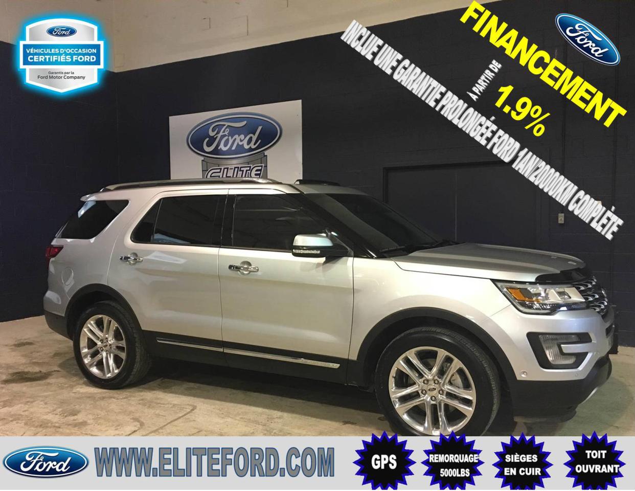 FORD EXPLORER LIMITED 2017, MOTEUR V6 3.5L, TRANSMISSION AUTOMATIQUE À 6 VITESSES, AWD, MAGS DE 20 POUCES, SIÈGES AVANT MASSANT, PORTE BAGAGE SUR LE TOIT, SYSTÈME DE STATIONNEMENT AUTOMATIQUE, SYSTÈME DE DÉTECTION D'ANGLE MORT, 7 PASSAGERS, CEINTURES ARRIÈRE GONFLABLE, ATTACHE REMORQUE AVEC CAPACITÉ DE REMORQUAGE DE 5000 LBS, CAMÉRA DE RECUL ET CAMÉRA DE STATIONNEMENT AVANT AVEC JET NETTOYANT, SIÈGES EN CUIR, SIÈGES AVANT À RÉGLAGE ÉLECTRIQUE CHAUFFANTS ET VENTILÉS, SIÈGES ARRIÈRE CHAUFFANTS, SYSTÈME DE CLIMATISATION THERMOSTATIQUE, SYSTÈME DE MÉMOIRE DU SIÈGE CONDUCTEUR, PÉDALIER RÉGLABLE, ÉCRAN TACTILE MY FORD TOUCH AVEC SYSTÈME DE NAVIGATION À COMMANDE VOCALE, TOIT OUVRANT PANORAMIQUE VISTA, RÉGULATEUR DE VITESSE, BLUETOOTH SYNC. *FINANCEMENT À PARTIR DE 1.9%*, PROGRAMME VÉHICULE D OCCASION CERTIFIÉ DISPONIBLE. ÉLITE FORD DISPOSE d UN VASTE GAMME DE VOITURES, DE CAMIONS ET DE VUS d OCCASION, NOUS COMPTONS PLUS DE 70 VÉHICULES À NOTRE INVENTAIRE. LIVRAISON RAPIDE, FINANCEMENT DISPONIBLE, NOTRE CONCESSION EST FACILE d ACCÈS POUR LES GENS DE SAINT-JÉROME, SAINTE-AGATHE, LACHUTE, BLANVILLE, SAINTE-THÉRÈSE ET LAVAL. ÉLITE FORD VOUS GARANTIE UN SERVICE ADAPTÉ À VOS BESOINS ET DES REPRÉSENTANTS SANS PRESSION. TOUT NOS VÉHICULE ON ÉTÉ INSPECTÉ ET SONT VENDUS AVEC UNE GARANTIE DU MANUFACTURIER ET UNE PROLONGATION EST TOUJOURS DISPONIBLE. NOUS VOUS GARANTISSONS LE MEILLEUR PRIX POUR VOTRE VÉHICULE d ÉCHANGE.