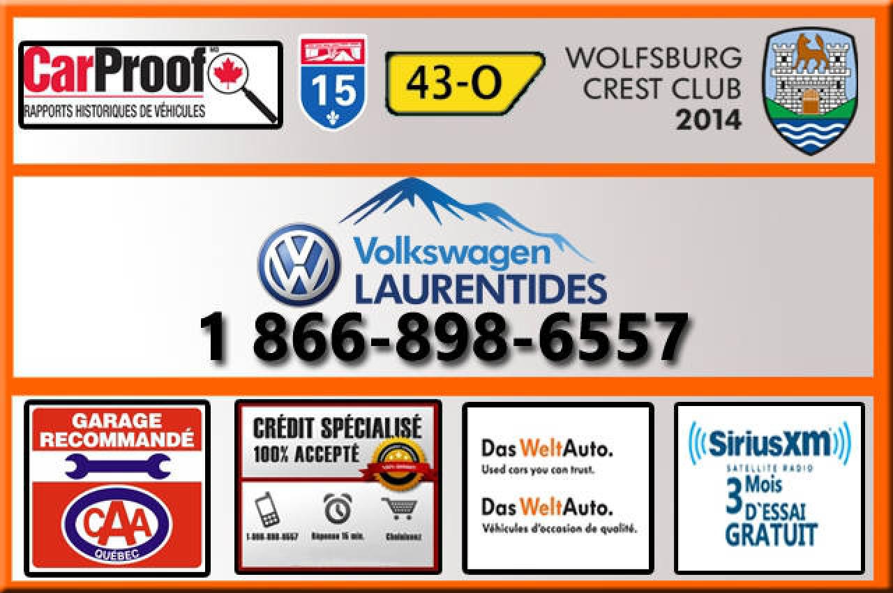 ** Volkswagen Laurentides est votre CHOIX #1 de la rgion des Laurentides! Membre du prestigieux Club lite Wolfsburg 2014, nous sommes les spcialistes pour tous vhicules d'occasions. SERVICE IMBATTABLE! Meilleur financement disponible sur le march. Rapport d'historique CARPROOF fourni gratuitement. Tous vhicules d'occasions sont inspects et passs la loupe par nos techniciens spcialiss pour vous. Faillite, difficult de crdit' Nous avons la solution! 1re 2e 3e chance au crdit! Venez faire un tour, nous sommes situs St-Jrme 10 minutes au nord de Blainville/Ste-Thrse/Boisbriand/Rosemre, 15 minutes de St-Eustache, 15 minutes au nord de Laval, 30 minutes de Montral. Au plaisir de vous voir!