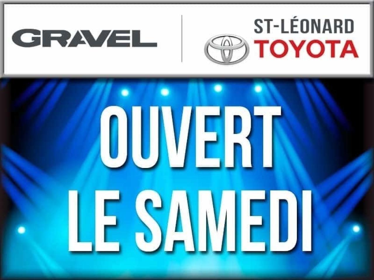 Jamais Accidenté ! Un Seul Propriétaire! BLUETOOTH CAMERA DE RECUL BAS KM TRASFERT DE GARANTIE PEA OR INCLUS Condition générale exceptionnelle et l`inspection certifiée de TOYOTA est complétée. 2e ET 3e CHANCE AU CRÉDIT SUR PLACE. Ouvert le samedi de 10h / 16h. Véhicules d'occasion certifiés en plus de 100 points mécanique et esthétique. Un rapport CARPROOF sans frais supplémentaire! GRAVEL TOYOTA ST-LÉONARD fait vraiment la différence sur place, venez nous mettre au défi. www.gravelauto.com. GRAVEL TOYOTA ST-LÉONARD na quun seul but, celui de donner le meilleur service après-vente et les meilleurs prix. Tous nos véhicules sont inspectés, certifiés en 100 points et chez GRAVEL TOYOTA ST-LÉONARD, on ne lésine pas avec la sécurité. Venez constater par vous-même la qualité de tous nos véhicules d`occasion. LE GROUPE GRAVEL, DEPUIS 1952 Pour un service sans limite! www.gravelauto.com. Nous répondons aux demandes d'informations par courriel 7/7 jours. ////////////////////////////////////////////////////////////////////////////////////////////////////////////////////////////////////////////////////////// Never been accidented! Only one owner ! Great overall condition and certified Toyota inspection completed. 2nd and 3rd chance credit available. Open on Saturdays from 10am to 4pm. Certified used vehicles with 100 point mechanical inspections. Carproof at no extra cost! GRAVEL TOYOTA ST-LÉONARD has one main goal : to give the best customer service with the best prices. Our dedicated sales team at GRAVEL TOYOTA ST-LÉONARD will make your car shopping experience a dream. Come see us at GRAVEL TOYOTA ST-LÉONARD. Le Groupe Gravel, in business since 1952....For a service with no limits: www.gravelauto.com. We will respond to your questions 7/7 days. Vehicles can be delivered anywhere in Quebec