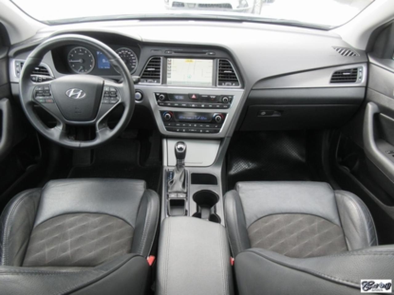 Hyundai Sonata Sport Tech 2016\n\nRégulateur de vitesse, Toit ouvrant, Essuie-glaces intermittents, Anti-démarreur, Freins ABS, Contrôle de stabilité, Coussin gonflable conducteur, Lecteur CD, Lecteur MP3, Coffre - Ouverture à distance, Miroirs chauffants, Portes électriques, Sièges électriques, Tachymètre, Vitres électriques, Air climatisé, Intérieur en cuir, Climatisation deux zones, Commandes audio au volant, Sièges arrières rabattables, Sièges chauffants, Volant ajustable, Aileron, Moulures protectrices latérales, Tapis protecteurs, Radio satellite, Ordinateur de bord, Caméra de recul, Radio AM/FM, Direction assistée, Télédéverrouillage, Système d'alarme, Rétroviseurs électriques, Jantes en alliage, Antipatinage, Phares antibrouillards, Coussins gonflables, Verrous de sécurité pour enfants, Dégivreur de lunette arrière, Miroirs ajustables de l'intérieur, Sièges baquets, Technologie Bluetooth intégrée, Port USB, Climatiseur automatique, Volant chauffant\n\nWOW!!! 8 PNEUS COMME NEUFS (été + hiver) + 8 MAGS INCLUS, intérieur cuir et tissus, toit panoramique, NAVIGATION, caméra de recul, entrée sans clé, "bluetooth", gr. électrique, A/C, climatisation et chauffage thermostatique et +++. Carproof disponible, aucun accident!!!