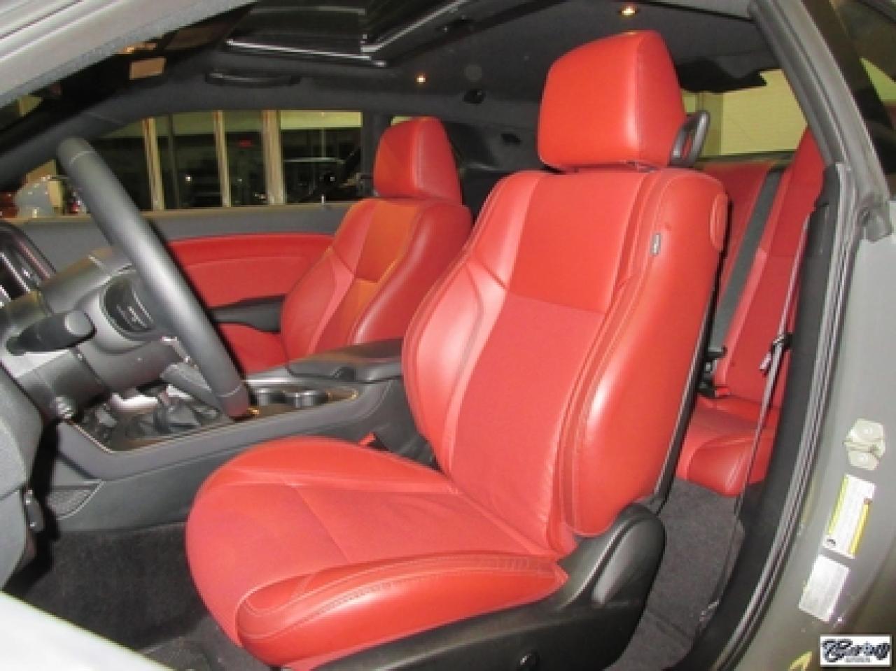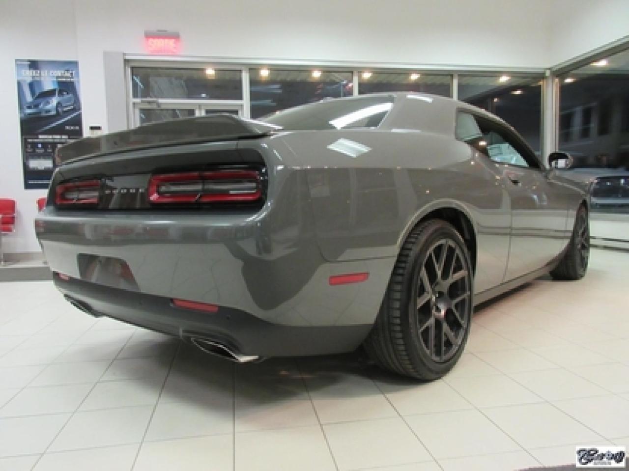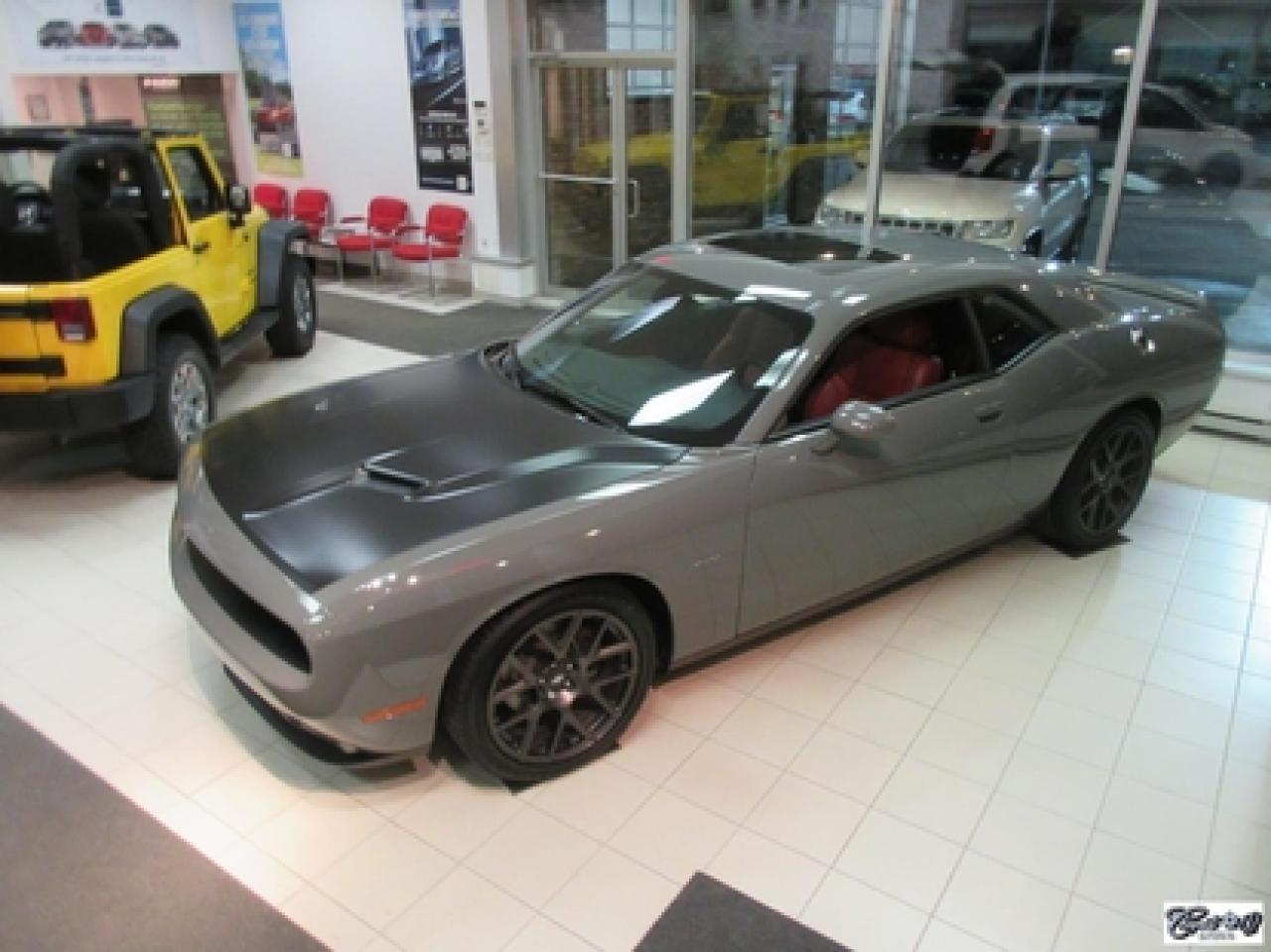 Dodge Challenger R/T 2017\n\nRégulateur de vitesse, Toit ouvrant, Essuie-glaces intermittents, Anti-démarreur, Freins ABS, Contrôle de stabilité, Coussin gonflable conducteur, Lecteur MP3, Chauffe-moteur, Miroirs chauffants, Portes électriques, Sièges électriques, Tachymètre, Vitres électriques, Air climatisé, Intérieur en cuir, Climatisation deux zones, Commandes audio au volant, Sièges arrières rabattables, Sièges chauffants, Volant ajustable, Aileron, Tapis protecteurs, Phares haute intensité, Radio satellite, Ordinateur de bord, Caméra de recul, Radio AM/FM, Sièges ventilés, Direction assistée, Télédéverrouillage, Système d'alarme, Rétroviseurs électriques, Jantes en alliage, Antipatinage, Phares antibrouillards, Coussins gonflables, Système de surveillance de la pression des pneus, Dégivreur de lunette arrière, Miroirs ajustables de l'intérieur, Sièges baquets, Technologie Bluetooth intégrée, Port USB, Climatiseur automatique, Système HomeLink, Volant chauffant\n\nWOW!!! LOOK D'ENFER... Transmission manuelle 6 vitesses TREMEC, tout équipé, intérieur en cuir rouge, couleur extérieur très spéciale "DESTROYER GRAY", sièges chauffants et ventilés, NAVIGATION, toit ouvrant, caméra de recul, système de son HARMAN KARDON à 18 hauts-parleurs, "bluetooth", ensemble SUPER TRACK PAK, freins haute performance, mags 20" en aluminium forgé, phares au XÉNON et +++. Très performante, faut voir, UNIQUE sur le marché!!! Une voiture sport aux allures de mauvais garçons.. ÉPARGNEZ PLUS DE 10000$ versus un neuf... Carproof disponible, aucun accident...
