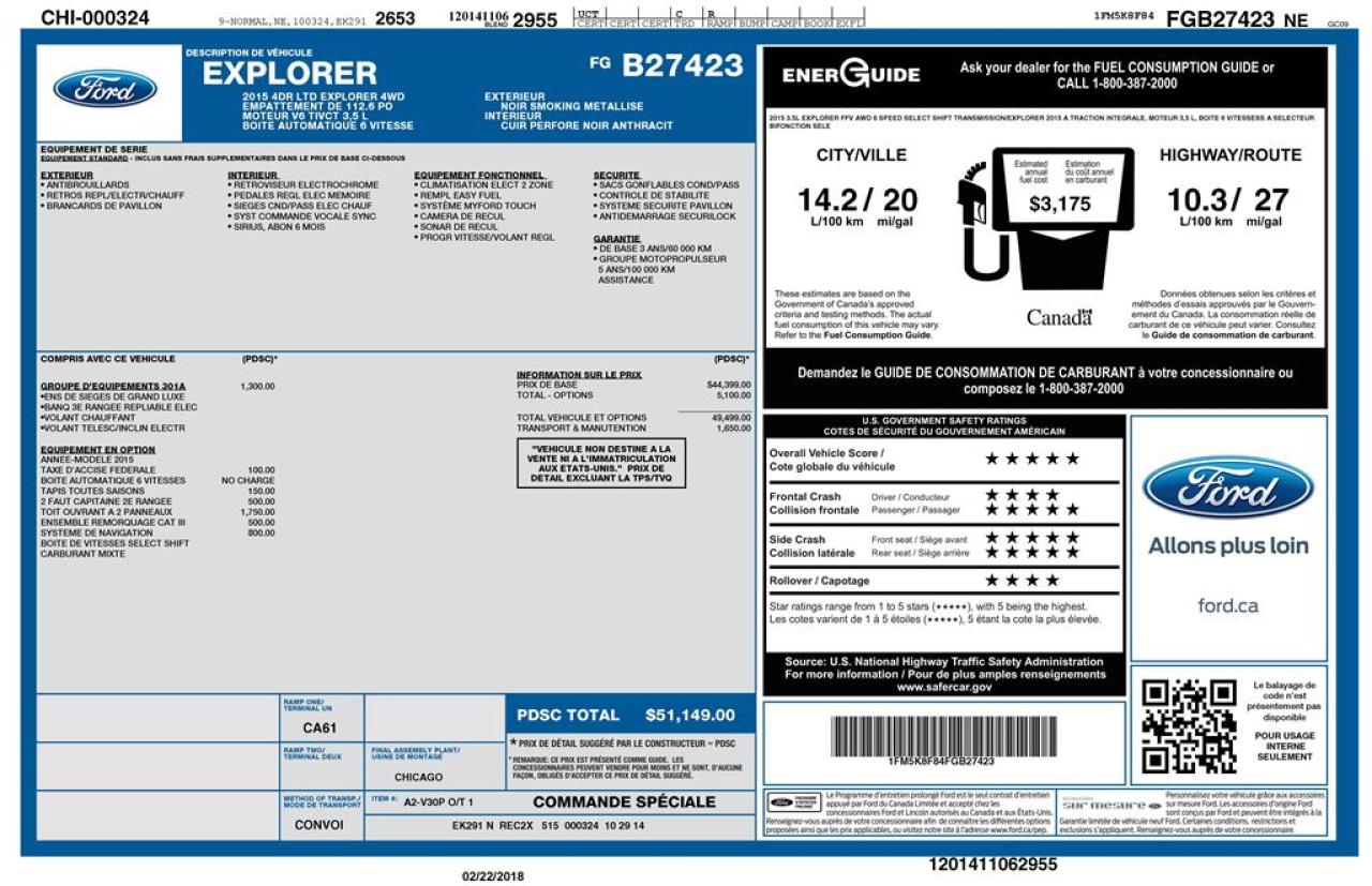 VÉHICULE JAMAIS ACCIDENTÉ !! - ENTIÈREMENT ÉQUIPÉ !! - PNBV : 2776 - TAILLE D'ORIGINE DES PNEUS : 255/50 R20 - MOTEUR DE 3.5L - CAPACITÉ DE REMORQUAGE : 5 000 LBS - VERROUILLAGE DES PORTES PAR CODE - VITRES ÉLECTRIQUES - MIROIRS ÉLECTRIQUES / CHAUFFANTS / RABATTABLE - PHARES AUTOMATIQUES - COMMANDES AU VOLANT - COMMANDES VOCALES - CONNECTIVITÉ BLUETOOTH - RÉGULATEUR DE VITESSE - SYSTÈME ANTIPATINAGE - LIMITEUR DE VITESSE EN DESCENTE - OPTION SELECT TERRAIN - NAVIGATION - CAMERA DE RECUL - SONAR DE RECUL - CLIMATISATION 2 ZONES - SIÈGES ÉLECTRIQUES / CHAUFFANTS / VENTILÉS / MÉMOIRE - TOIT PANORAMIQUE - HAYON ÉLECTRIQUE - VOLANT GAINÉ DE CUIR / CHAUFFANT - RADIO CD / SATELLITE - RÉGULATEUR DE TEMPÉRATURE AUTOMATIQUE - PUSH START BUTTON - PRISE USB / AUXILIAIRE / 12 VOLTS **** LAQUERRE AUTO, LE PLUS GROS INVENTAIRE DE VÉHICULES D'OCCASION DES BOIS-FRANCS *** 1ÈRE, 2IÈME ET 3IÈME CHANCE AU CRÉDIT **** TAUX D'INTÉRÊT À PARTIR DE 3.99% **** LIVRAISON LE JOUR MÊME **** NOUS LIVRONS PARTOUT AU QUEBEC **** CONTACTEZ NOUS PAR TÉLÉPHONE : 1-866-928-7165 OU PAR TEXTO : 1-819-979-2999 / 1-819-350-7976****